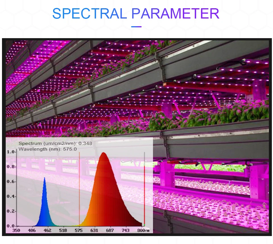 Спектра нашей продукции является 400-830nm, этот растительный светильник перенял импортный светодиодный чип, светильник Тип источника находится ближе к солнцу, со всеми светильник источников, необходимые для рост растений, успешно выращивайте растения здоровыми.