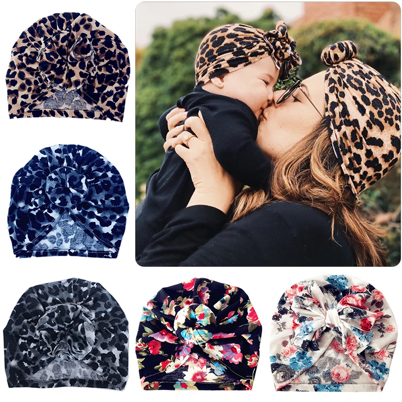 Повязка на голову для мамы и ребенка на весну и осень, тюрбан с леопардовым цветочным принтом и бантом для младенцев, повязка на голову, аксессуары для волос для новорожденных девочек