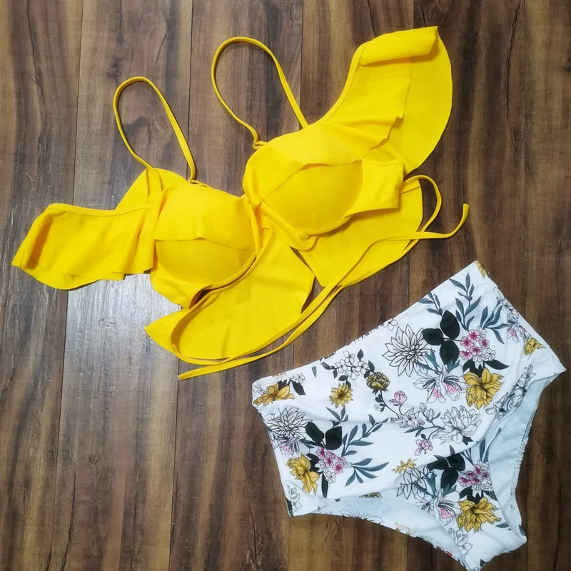 Комплект бикини с высокой талией для женщин, пикантный купальник с оборками, с цветочным принтом, с завышенной талией, женские бикини 2021, зеленые бикини, размера плюс S - XXL
