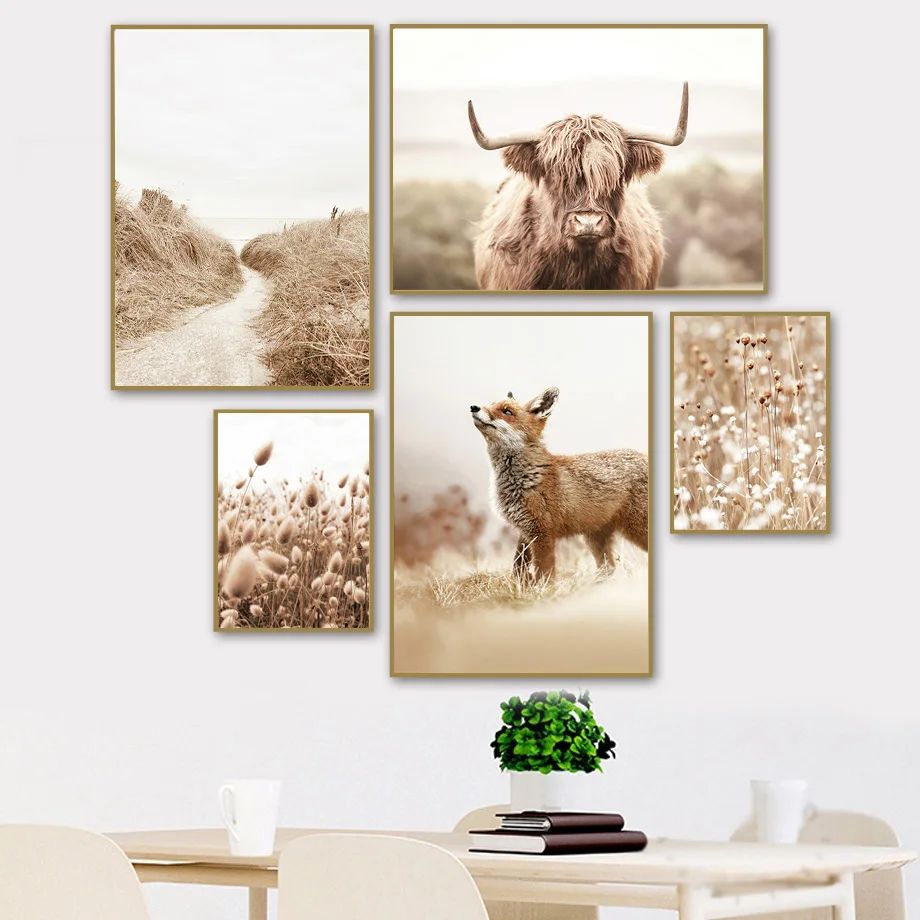 Корова лиса полевая трава высокий постер летний пейзаж настенный художественный принт на холсте Пляж картина с волнами украшение гостиной