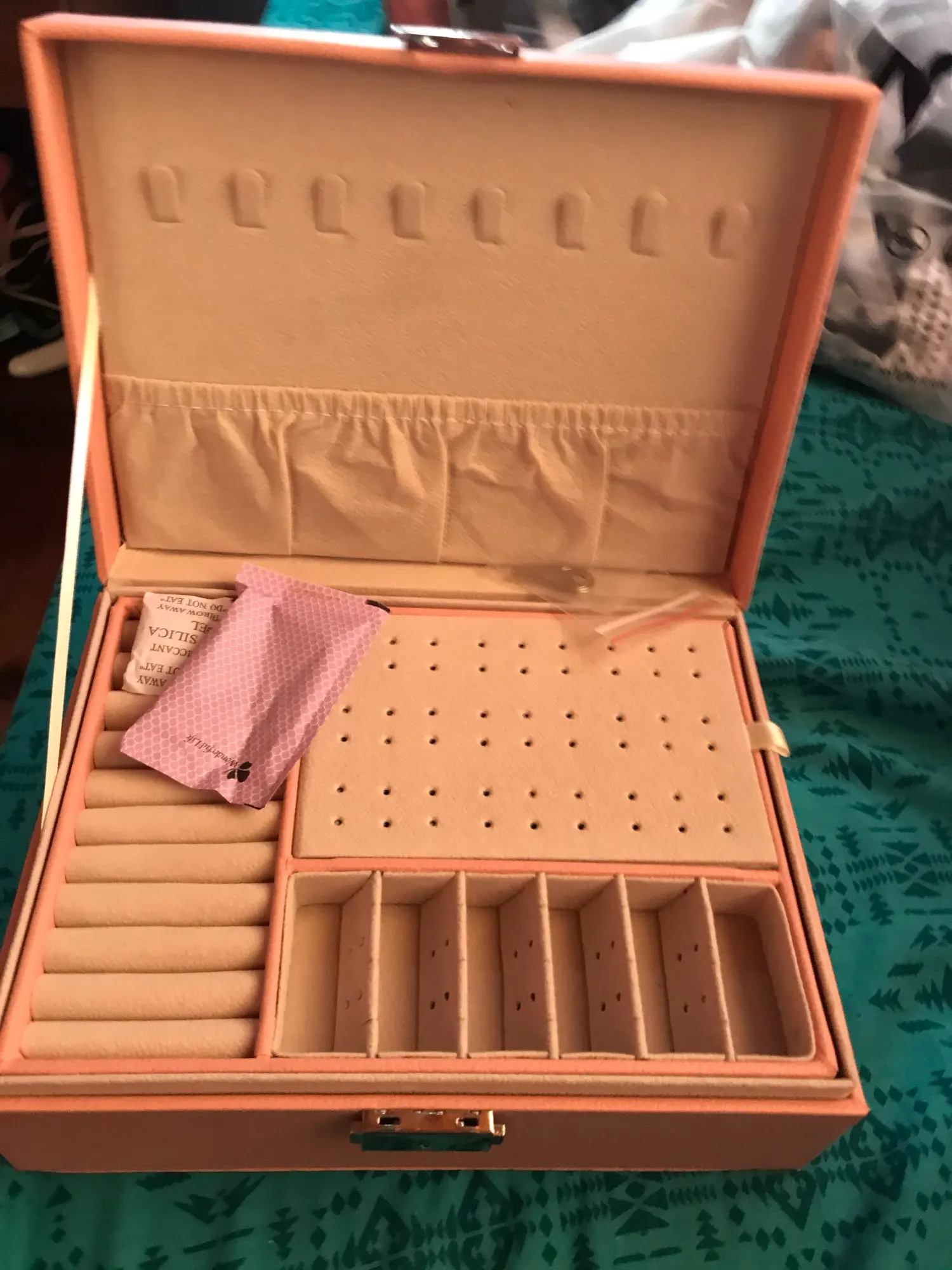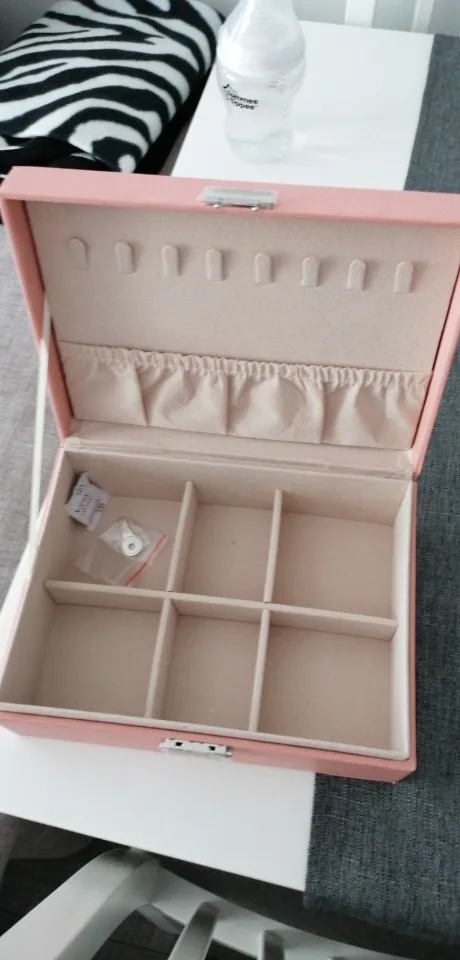 Es hermoso e igual a las fotos , no le puse 5 estrellas porque el vendedor demoro más de 10 días en enviar el producto desde que lo compré, casi cuando iba a vencer el plazo máximo para enviarlo. Me gusto el material y color, diseño, las divisiones de dentro son como cartón grueso eso si . Bonito . Útil para lo que pedí