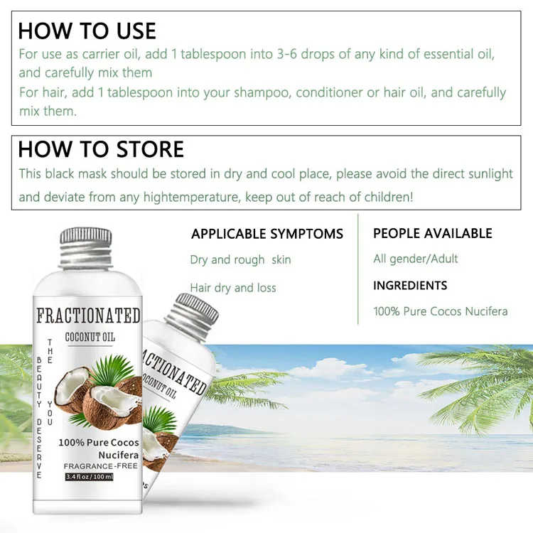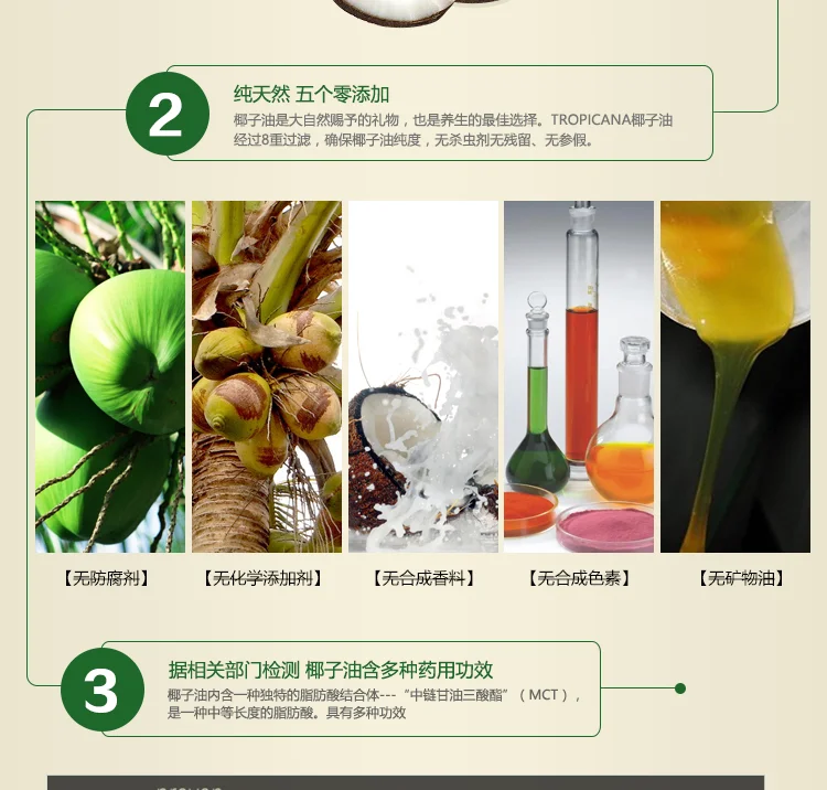 Тропикана 100% натуральный органический Экстра виргинское кокосовое масло хорошо подходит для вашей здоровой кожи и волос, обогащенная Лауриновая кислота, которая является «жирной кислотой средней цепи», которая очень полезна в качестве дополнительной формы монолаурина внутри организма человека. Лауриновая кислота антибактериальные характеристики и антиоксидант. Мягко наносится на кожу, она нежирная и гипоаллергенная. Нанесите кожу после принятия ванны для восстановления влаги, сохраняя молодой и антивозрастной результат. -Удалите косметику. -Массаж для расслабляющих мышц. -Храните хорошую кожу головы и против перхоти, оставив в волосах 1-2 часа до шампуня для предотвращения выпадения волос.