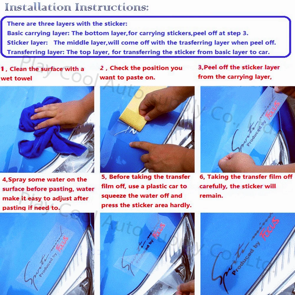 Инструкция по установке:1. Безводная пастаБудет размещен на сайте чисто. Сухой.Отрежьте полностью или часть конца бумаги, установите правильное положение, зафиксируйте на верхнем конце, сверху вниз Наклейте на корпус.Используйте пластиковый скребок или банковскую карту и выскабливание вперед, экструзия будет полностью воздушной.2. Водная пастаБудет размещен на сайте чистымУдалите все на конце или бумагу, водное чистящее средство распылите на кузов автомобиля клейкую область и наклейки на поверхность десен.Установите удобное положение, наклейка аккуратно прикрепится к корпусу автомобиля пластиковой скребок для соскребания, выскабливая воду и воздух.Сушите естественным воздухом в течение 30 минут, затем снимите переводную пленку.Советы:Никогда не оставляйте автомобиль под горячим солнцем в течение 48 часов после установки!Не мойте машину в течение 48 часов после установки!