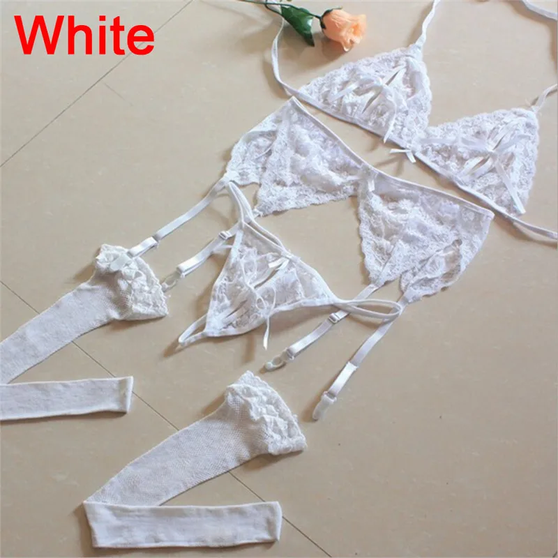 4 шт.компл. Женские комплекты нижнего белья, бюстгальтеры, сексуальные кружевные стринги с открытой промежностью + бюстгальтер + сетчатые носки + комплект нижнего белья, экзотические аксессуары для флирта