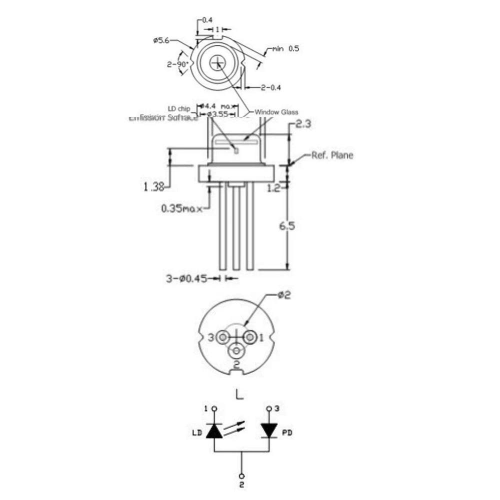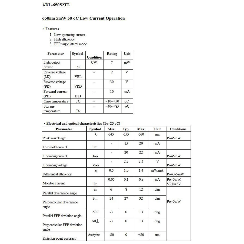 ● Длина волны: 650 нм• Рабочее напряжение: 2,2 V-2,4 V● Входной ток: менее 40 мА● Посылка: 5,6 мм (при температуре-18)● Мощность: 5 мВт● Особенности: с PD и стеклянным окном● Срок службы: более 10000 часов