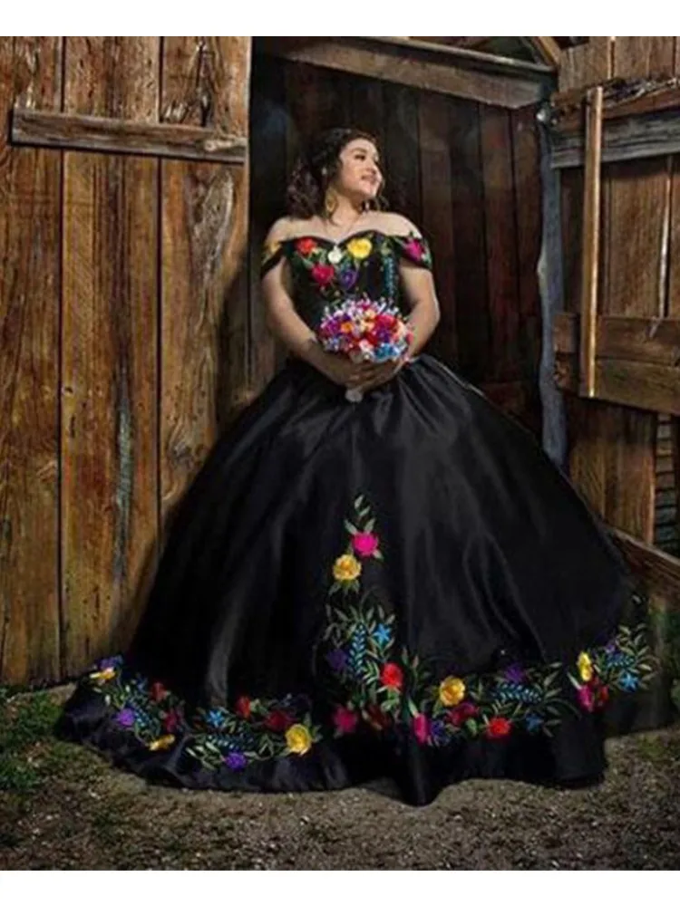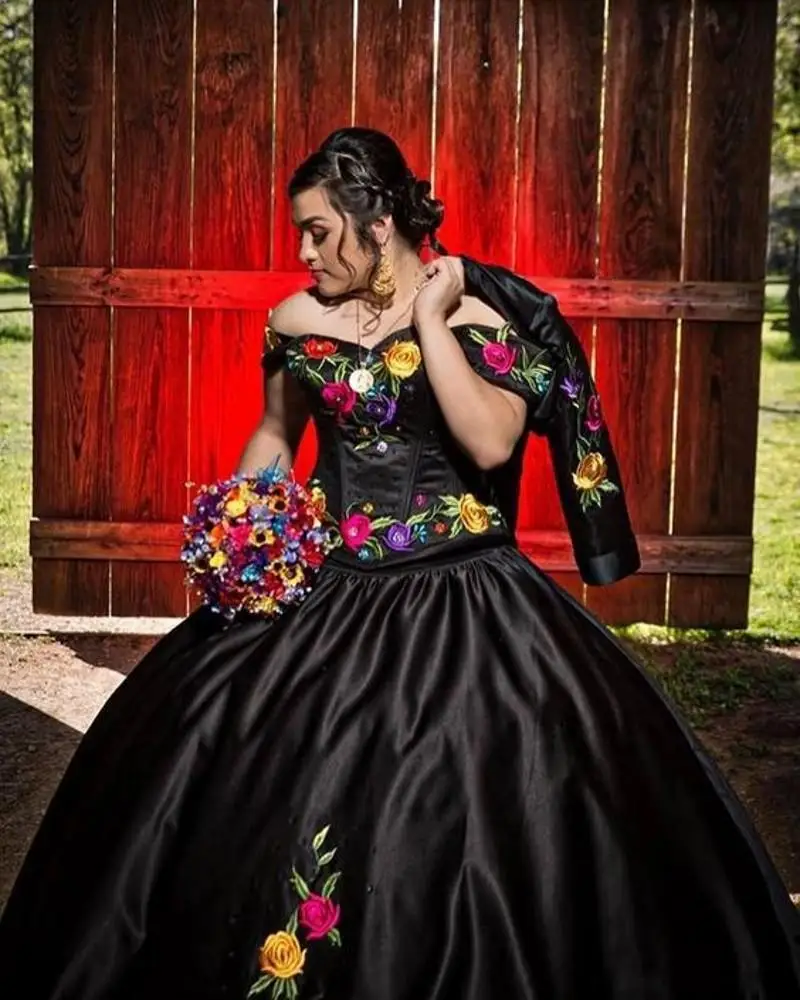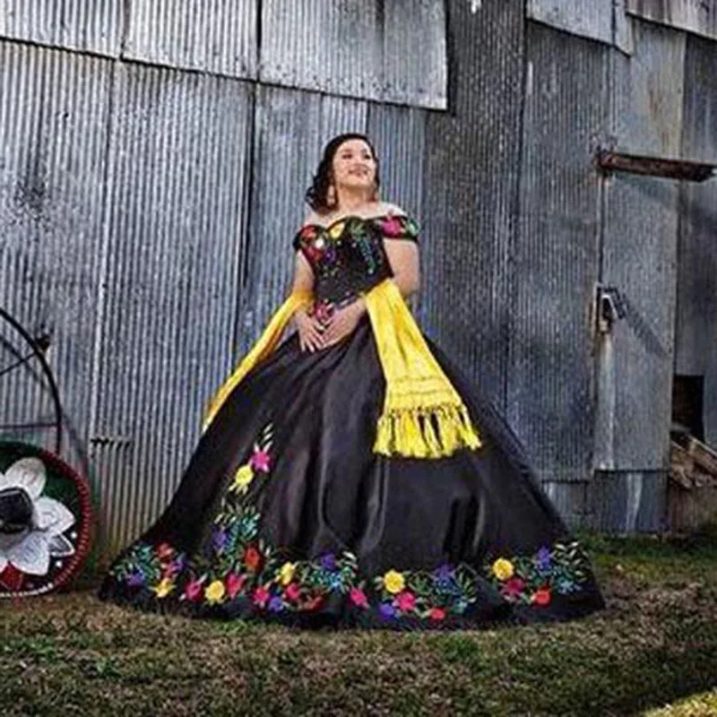 Сексуальное черное мексиканское цветное бальное платье с цветочной вышивкой, Атласное Бальное платье для выпускного вечера и торжественной вечеринки, 2022, платье принцессы 15