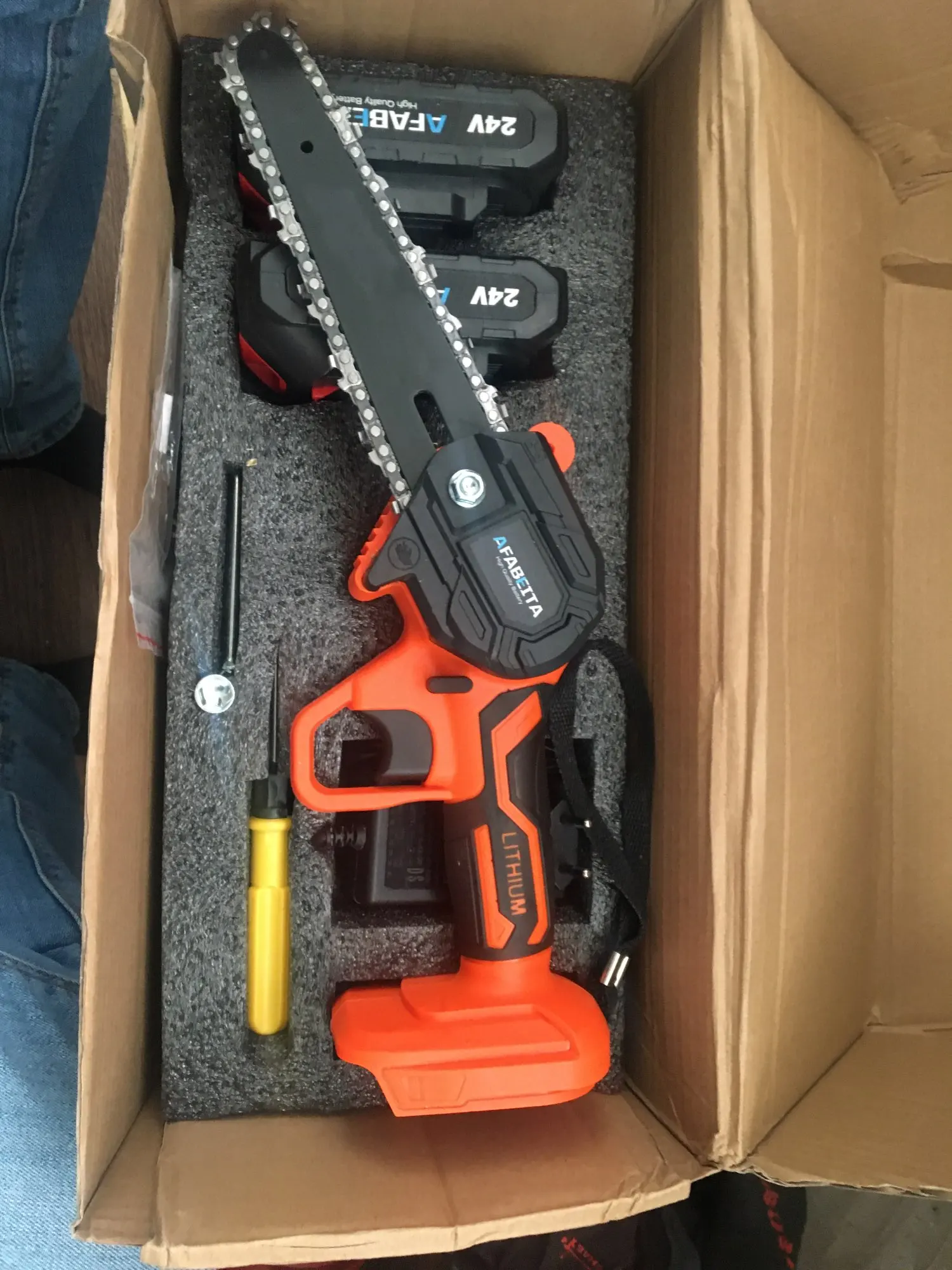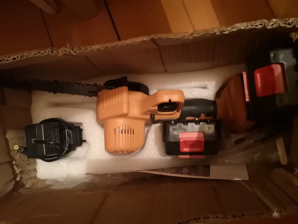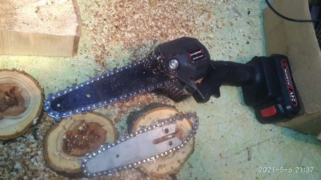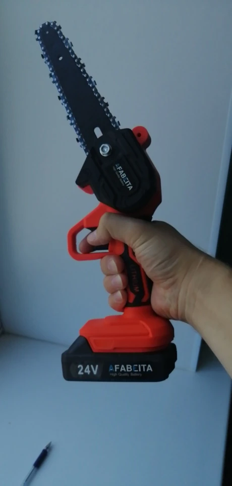 Доставка долгая - 50 дней в Украину через Польшу. Коробка слегка помята, но внутри все цело. Аккумы для макиты не подходят - не хватает пропилов. Хотя может у макиты несколько стандартов есть. Сами акб на 18 вольт, а не на 24, как на наклейках. И они пришли неодинаковые - немного по разному собраны и разные банки внутри. Судя по банкам емкость одного 1500 мАч. Пила собрана хорошо. Кнопка с фиксацией, но без регулятора оборотов. Он в пиле совершенно не нужен. Даже бензопилами я всегда пилю на максимальных. Теперь по работе пилы - для такой крохи пилит неплохо. Справляется с сырой акацией 15 см. И сухим дубком. Когда цепь клинит - срабатывает защита в акб и отрубает питание на пару секунд. Цепь рекомендую обязательно смазывать при работе. Я просто макаю конец шины с цепью в банку с маслом. Жаль, что нет емкости для масла в самой пиле. Пилка понравилась. Считаю, можно смело покупать для подрезки веток в саду.