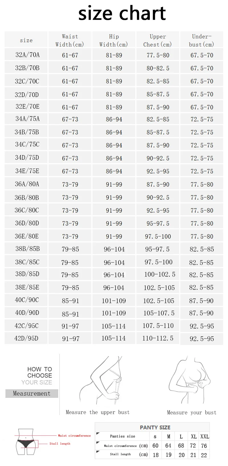 Бюстгальтер размера 70 с трусиками размера S подходит для бедер 81-89 см, талии 57-61 см Бюстгальтер 75 размера с трусиками размера M подходит для бедер 86-94 см, Талии 61-64 смБюстгальтер 80 размера L подходит для бедер 91-99 см, талии 64-68 см Бюстгальтер 85 размера с трусиками размера XL подходит для бедер 96-104 см, талии 68-72 см Бюстгальтер 90 размера с трусиками размера XXL подходит для бедер 101-109 см, талии 72-76 смБюстгальтер размера 95 с трусиками размера XXL подходит для бедер 101-109 см, талии 72-76 смЕсли вам нужны трусики разных размеров, просто укажите это в заказе. Мы отправим вам нужные вам трусики. Спасибо!