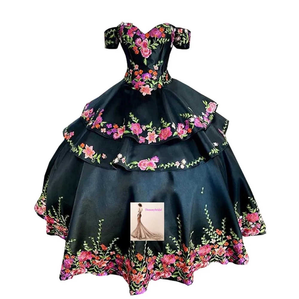 Сексуальные черные мексиканские платья для Quinceanera 2022 цветочн...
