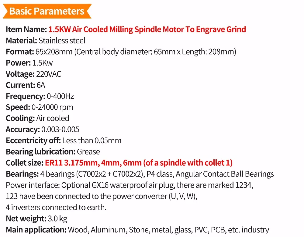 1 x двигатель шпинделя с воздушным охлаждением 1,5 кВт (ER11, 24000 об/мин, 220 В, 400 Гц)