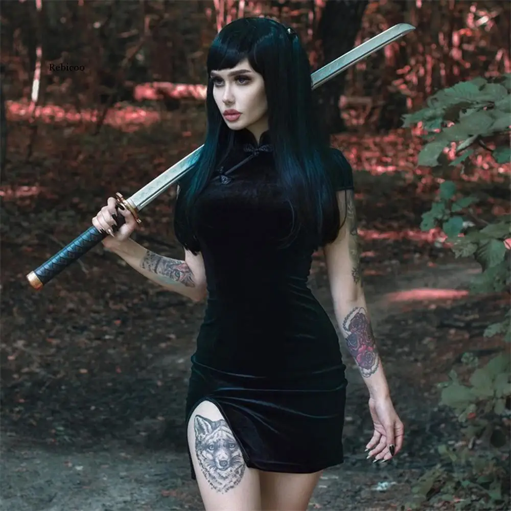Женские ботильоны в ретро стиле, в готическом стиле винтажный тканевой фон для Cheongsam бархатные мини платье элегантные пикантные китайский Стиль в готическом стиле однотонные черные вечерние платье Ципао