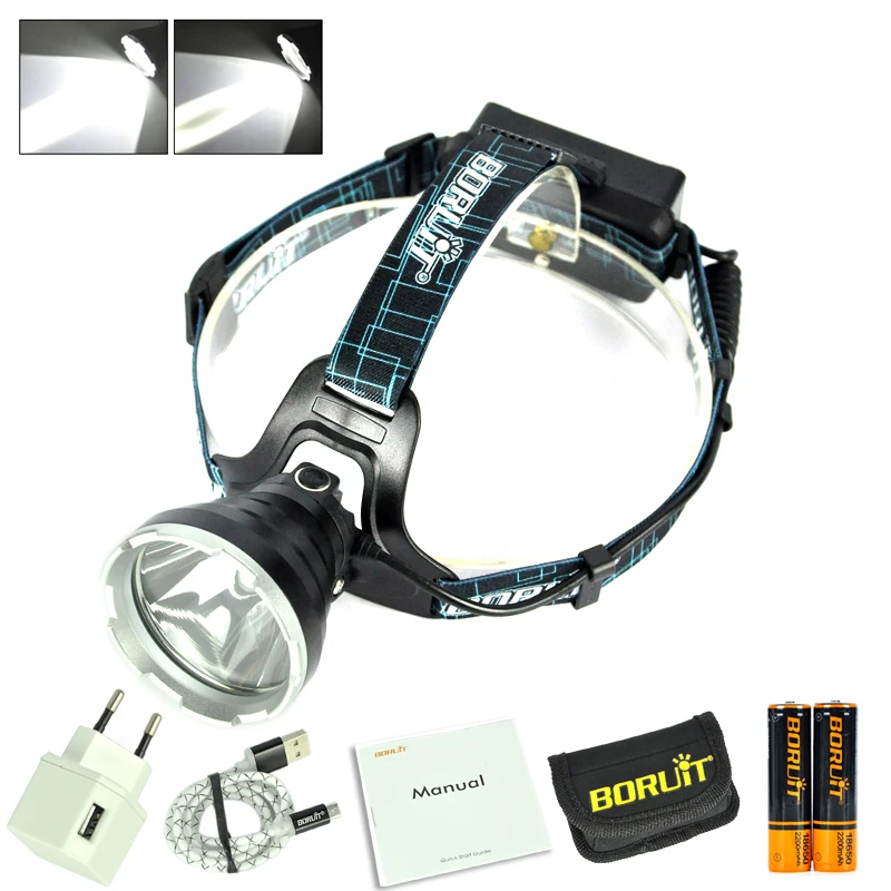 Вариант A: 1 перезаряжаемый налобный фонарь xBORUIT B10, Вариант B: 1 перезаряжаемый налобный фонарь xBORUIT B10, 2 литий-ионных аккумулятора 18650 с печатной платой, 1 настенное зарядное устройство, 1 usb-кабель, 1 тканевый мешок, 1 Инструкция