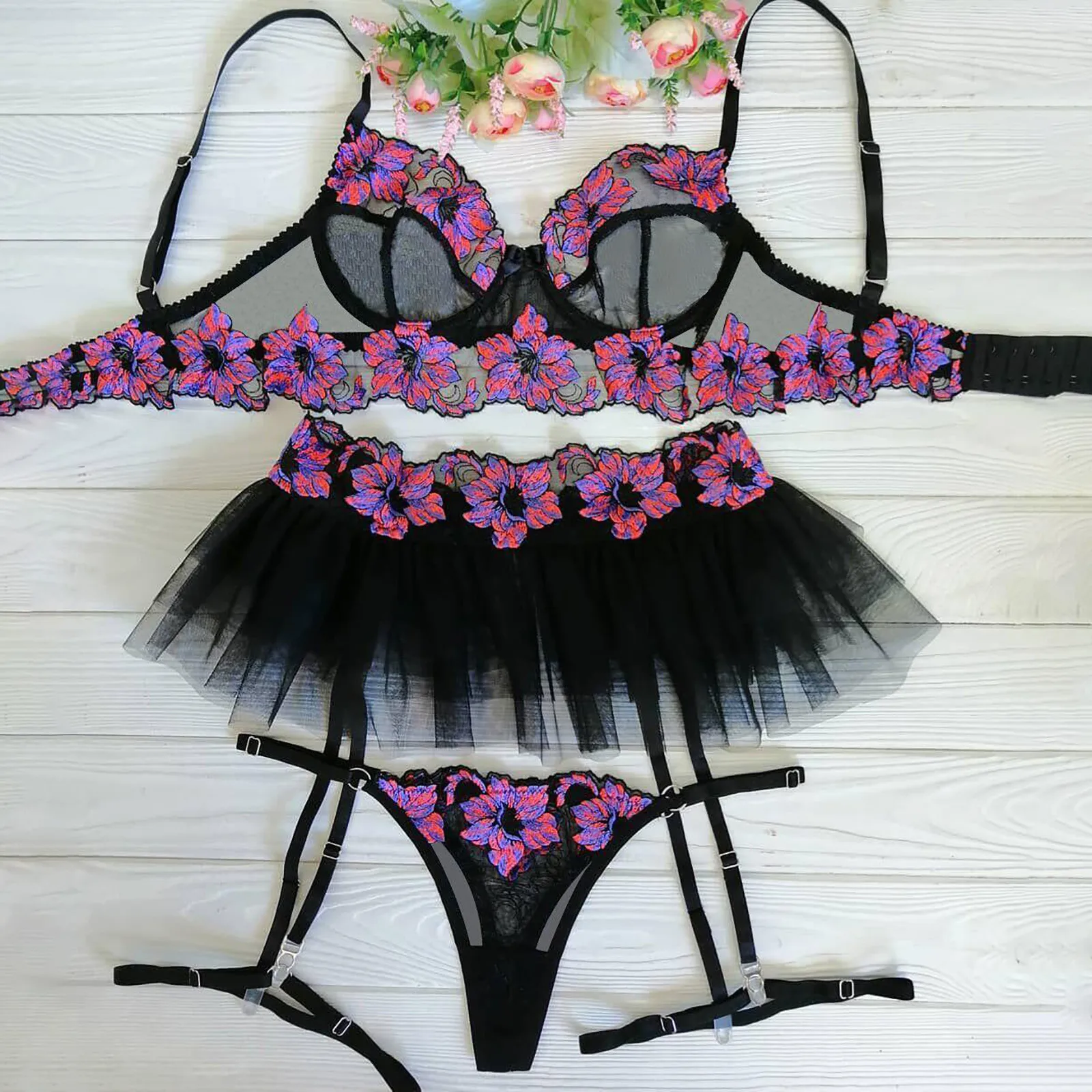 Женское сексуальное нижнее белье, изысканное кружевное нижнее белье с вышивкой из 3 предметов