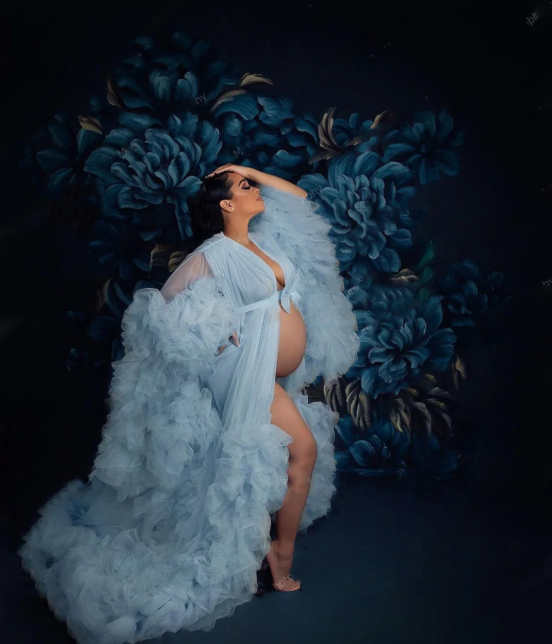 Очень Пышное Тюлевое платье для беременных для фотосъемки с оборками с длинными рукавами голубой халат для беременных Платья для фотосъемки женское платье-реквизит