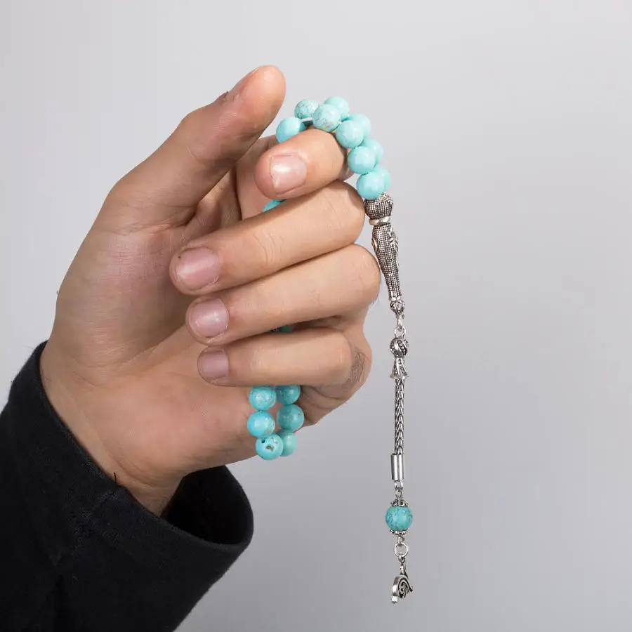 Бирюзовый драгоценный камень Длина: 27 см Размер бисера: 8x8 см Длина кисточки: 13 см Кисточка: Серебряная кисточка
