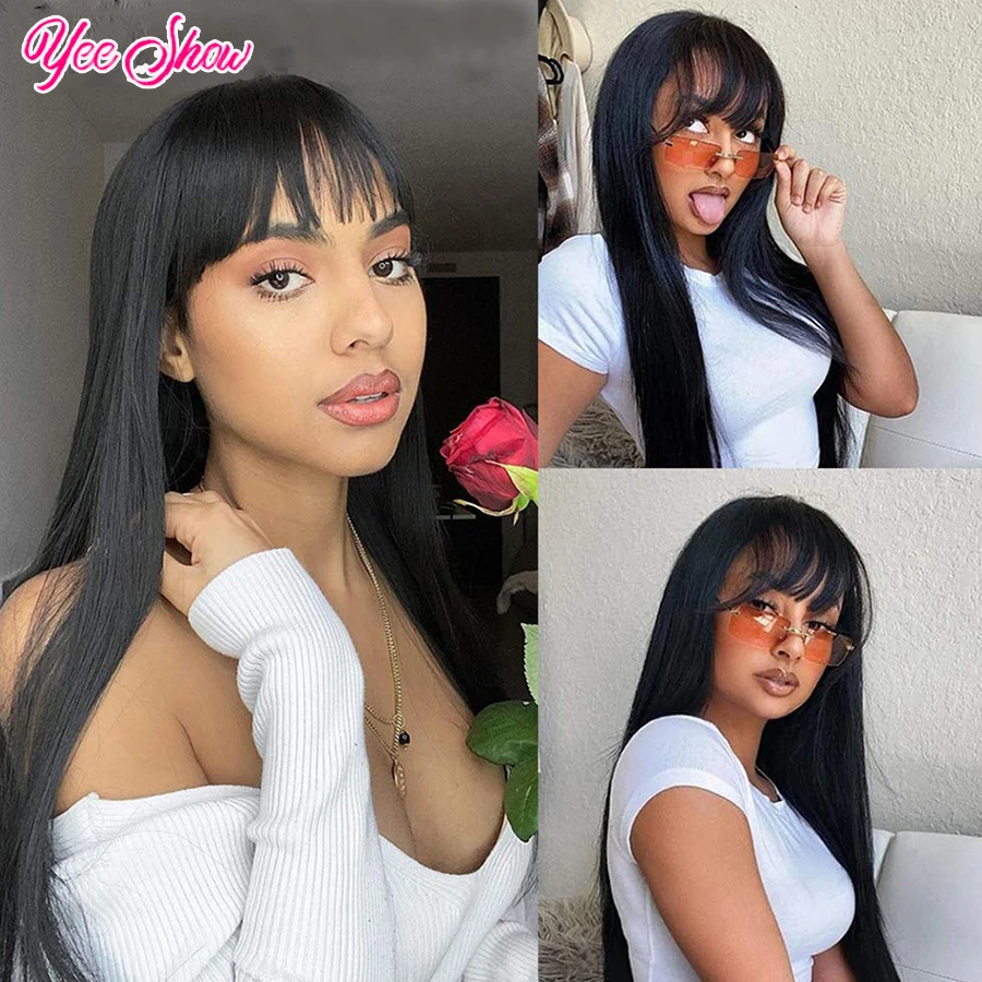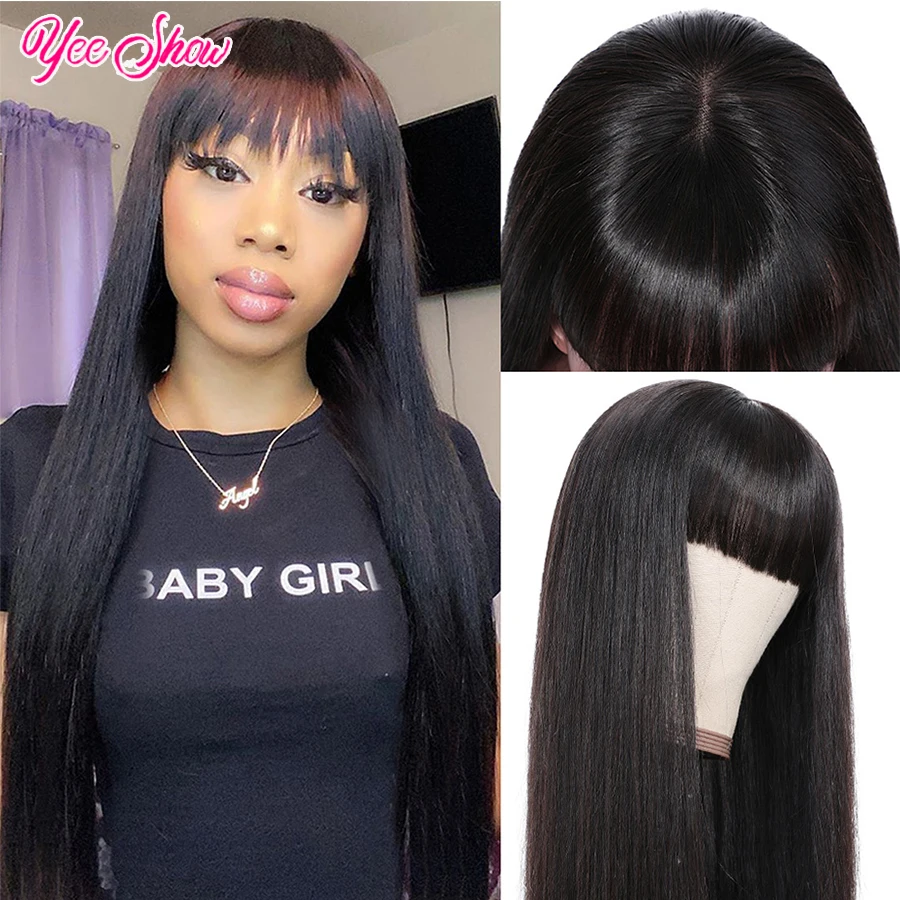 Парики из натуральных волос, прямые, с челкой, индийские, неповрежденные, плотность 150%, для чернокожих женщин