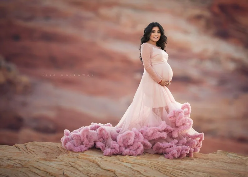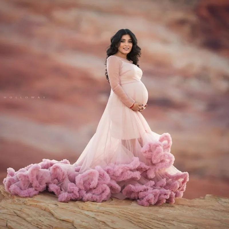 Розовый оборками развертки поезд для беременных фотосессия платья из тюля, прозрачная одежда с длинным рукавом Прозрачная Тюль свадебное платье; Robe для беременности и родам стрелять 2021