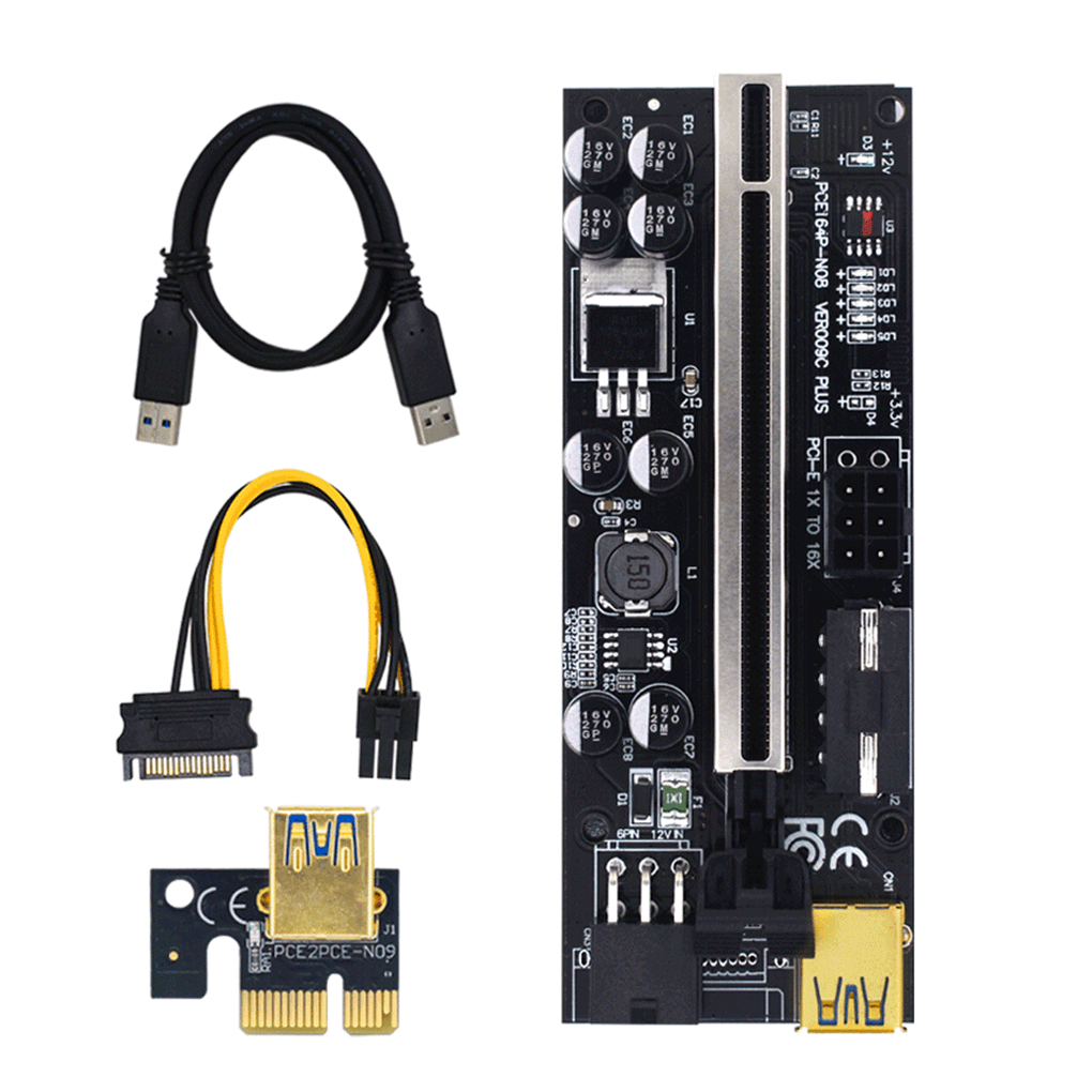 Технические характеристики:Интерфейс: PCI-E 16X.Длина кабеля: прибл. 60 см/23,6 дюймов.Цвет шлиц: красный, черный.Цвет кабеля: красный, черный.Материал: золото + PceA.Размер: как на картинке.Посылка включает в себя:6 шт. PCI-E 16x riser board.(с 6 шт. PCI-E 1x картой, 6 шт. кабель питания, 6 шт. USB 3,0 кабель, 6 шт. кабельный разъем)