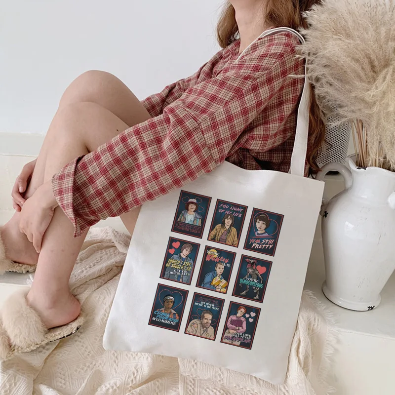 Очень странные дела с рисунками героев мультфильма для женщин сумка 2021 большой Ёмкость Harajuku Сумка Многоразовые Vogue Повседневная забавная через плечо в винтажном стиле из плотной ткани сумки