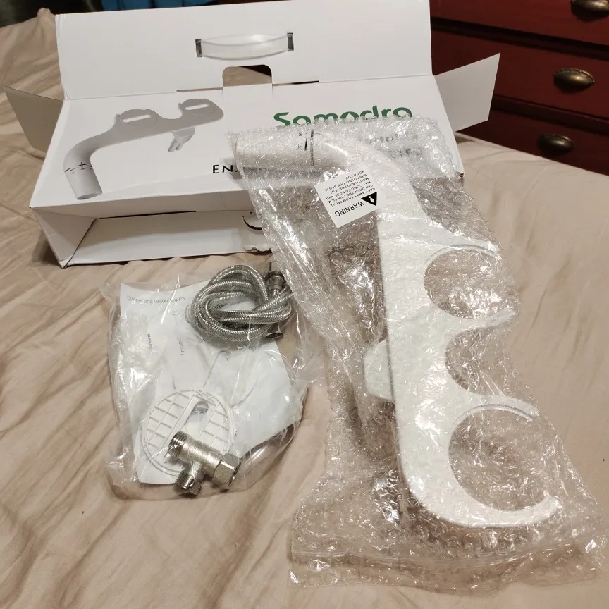 Все пришло в хорошем состоянии, хотя упаковка хлипковата, при пересылке возможно повреждение. Мне повезло - все пришло целым и невредимым. Изделие качественное. Проверил работоспособность подключив вместо душа. Все работает. Следующий этап - установка на место. Примерка на унитаз показала, что дополнительно на 4 опорные точки сиденья унитаза необходимо доклеить дополнительные силиконовые прокладки толщиной 3мм, т.к. сиденье унитаза касается данного изделия и может повредить его корпус. Подключение данной системы необходимо произвести к сетям водоснабжения через клапан-смеситель холодной и горячей воды, выставленный на определенную температуру для более комфортного использования.