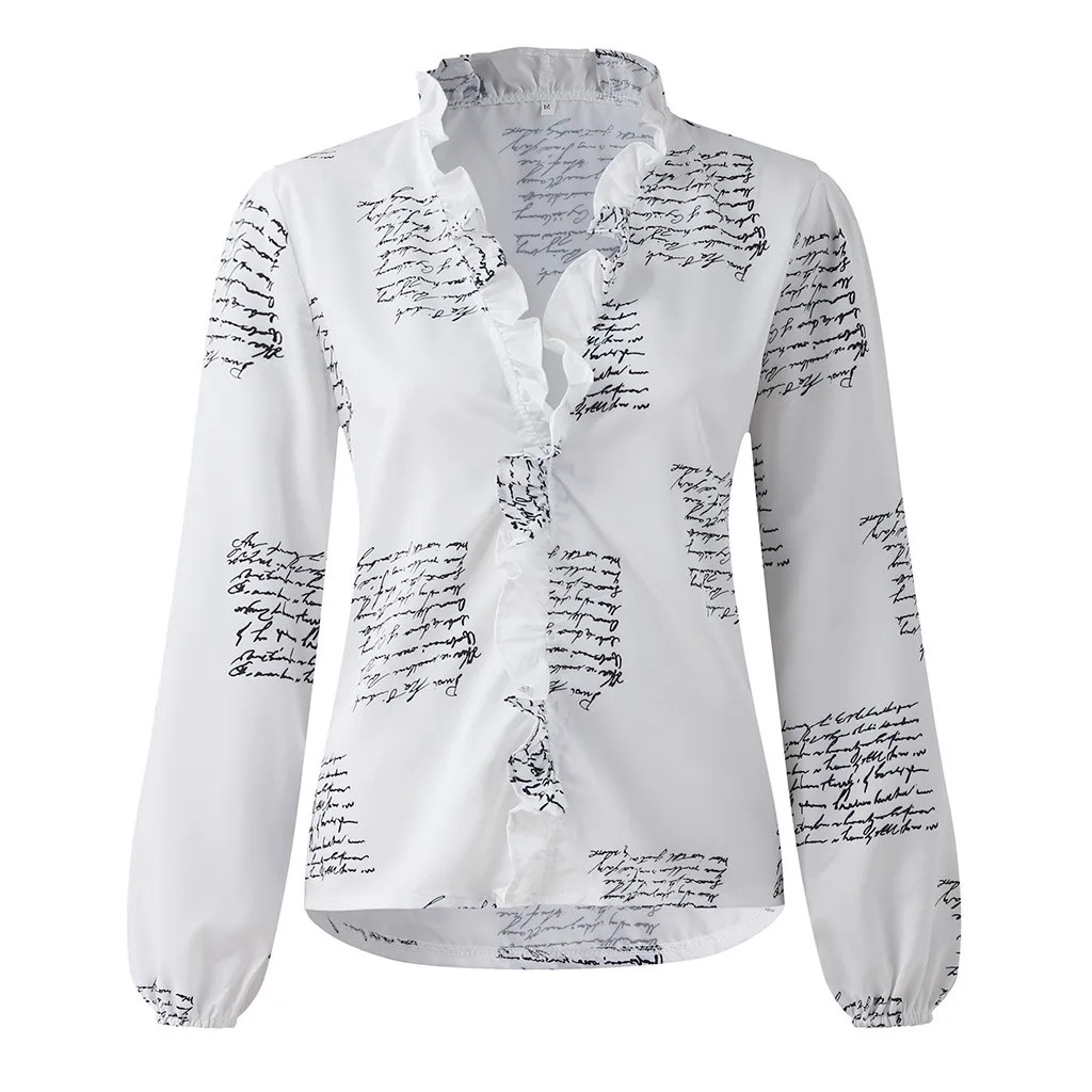 Женская офисная блузка с V-образным вырезом, однотонная Повседневная белая Рубашка с оборками и длинным рукавом, с принтом, 40 #, на лето
