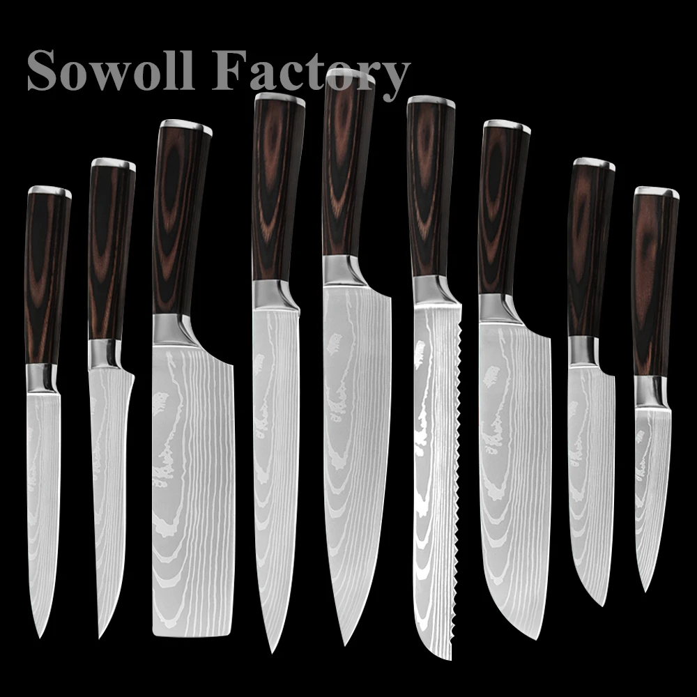 Кухонный нож Sowoll, 9 комплект ножей, нержавеющая сталь, 8 дюймов, шеф-повар, нарезка хлеба, 7 дюймов, нарезка сантоку, 5 дюймов, универсальный нож 3,5 дюйма, для очистки овощей