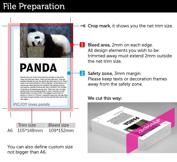 Формат файла: Мы предпочитаем файл PDF или PSD, AI, CDR Пожалуйста, Экспортируйте в области bleed, отметка corp. не является необходимой. Режим CMYK (не режим RGB) Разрешение: не менее 300 точек/дюйм Примечание: 1. Возможна погрешность в цвете <10%. 2. Текстовое содержимое в файле должно быть преобразовано в кривую. Кривая Означает преобразование текста в изогнутые сегменты линии. Предотвращает использование файлов специальными шрифтами. При открытии файла шрифт будет изменен. Часто задаваемые вопросы: 1. Когда я могу получить цену? Мы обычно указываем в течение 24 часов после получения вашего запроса. Если вам очень срочно нужно получить цену, пожалуйста, сообщите нам по электронной почте, чтобы мы рассмотрели Ваш запрос в приоритетном порядке. 2. Как я могу получить образец для проверки качества? После подтверждения цены, вы можете потребовать образцы для проверки нашего качества. Мы можем предоставить вам образец бесплатно, если вы оплачиваете Экспресс-доставку. Или сделайте видео, чтобы показать вам. 3. Каков минимальный заказ? Это 1 шт. 4. Какую информацию я должен дать, чтобы получить предложение? Вам необходимо указать материал, количество, размер и адрес доставки. Так что мы можем цитировать. 5. Каково время производства и время доставки? Обычно печать занимает 5-7 дней. Время доставки зависит от способа доставки. Быстрая доставка 5-7 дней. Общая экспресс-доставка составляет около 20 дней. 6. Как разместить заказ? Сообщите нам, когда будете готовы сделать заказ. Мы отправим вам ссылку для оплаты.