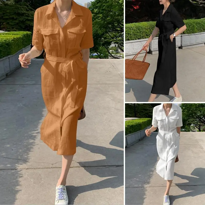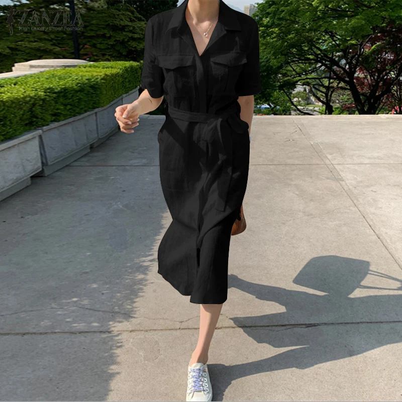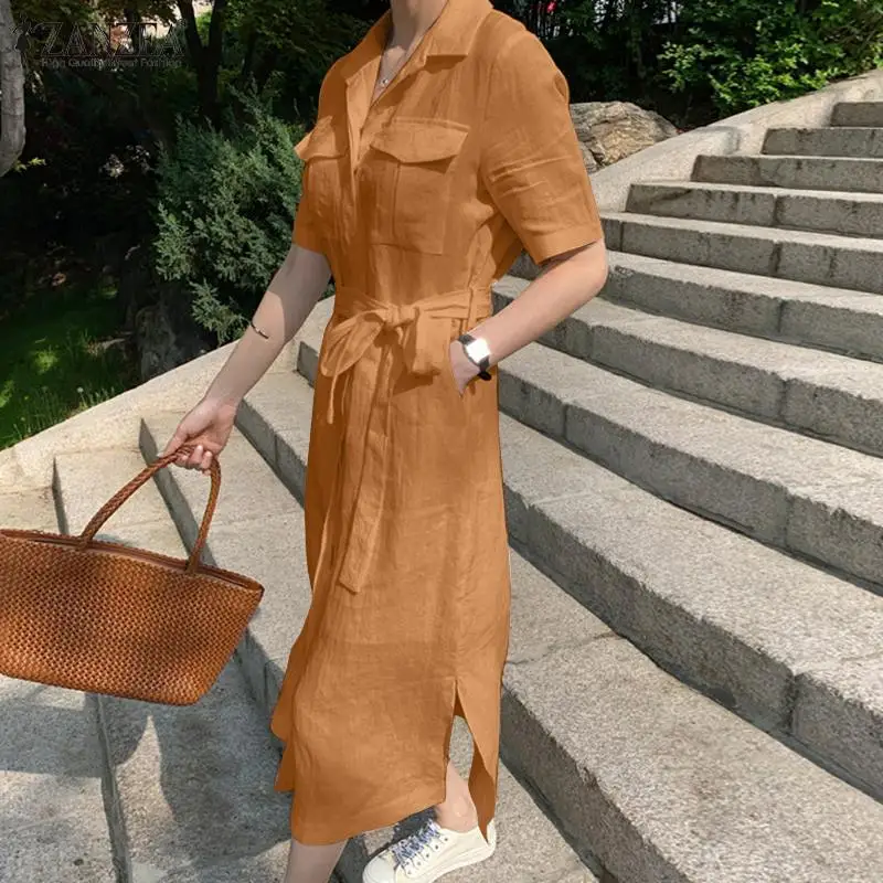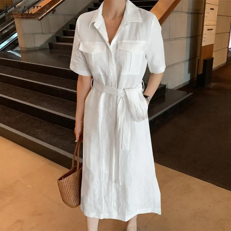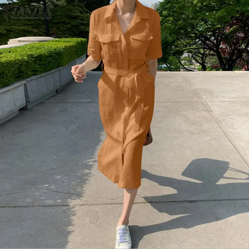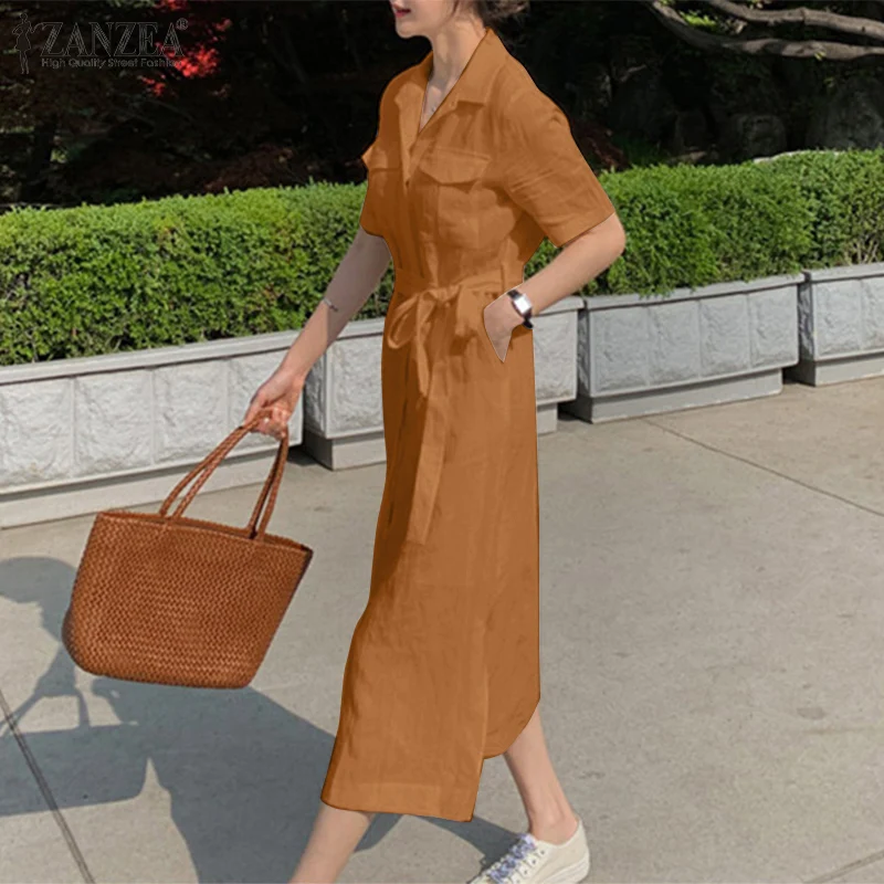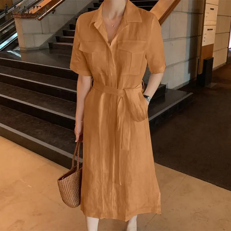 Летний офисный сарафан ZANZEA, элегантное женское длинное платье-рубашка с коротким рукавом и отворотом, повседневное однотонное платье с поясом, женское платье S-