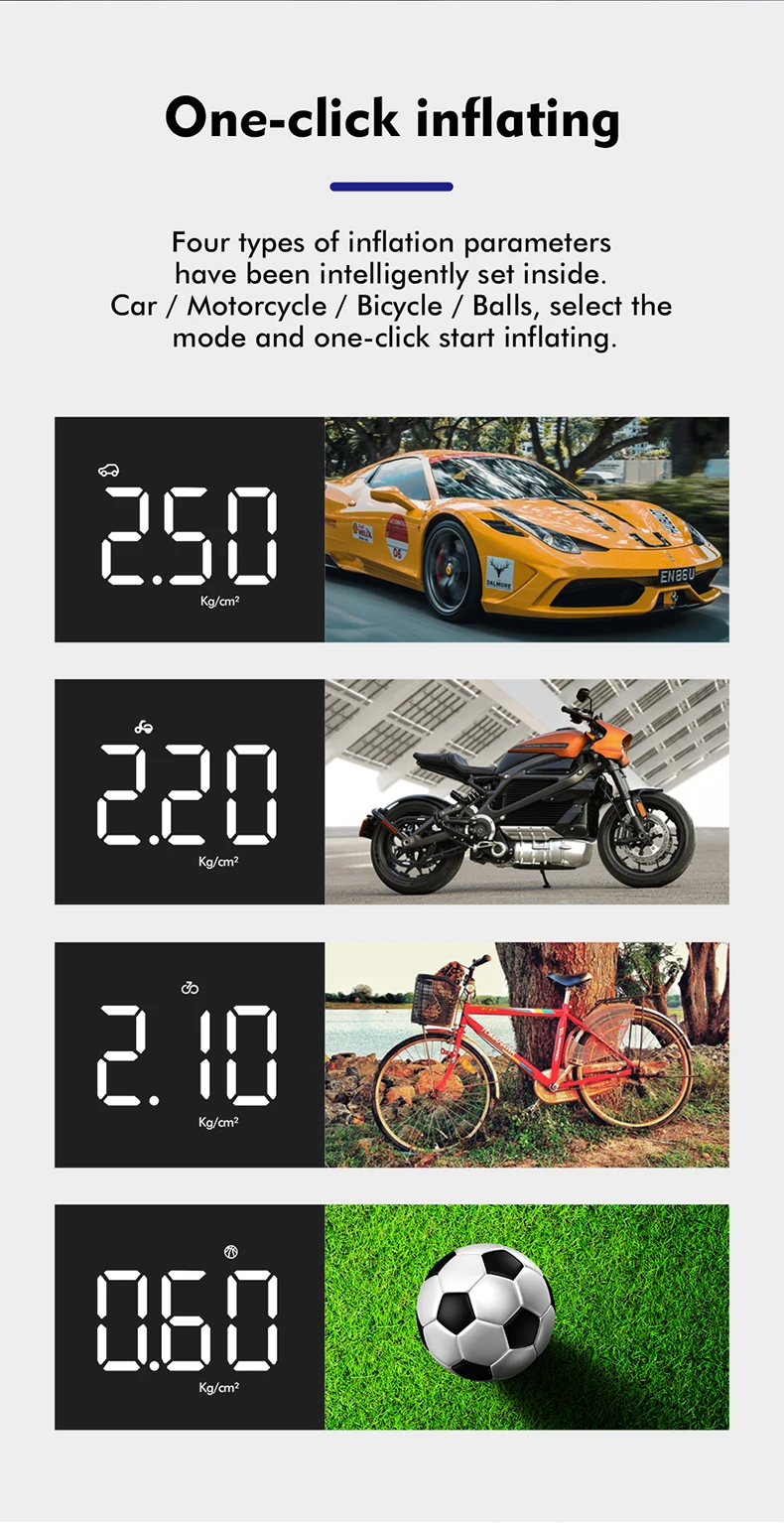 -Для автомобилей/SUV/RV шин -Для велосипедных/мотоциклетных шин -Для спортивного оборудования -Для надувных игрушек Примечание: Не для фургонов, автобусов, домов, грузовиков.