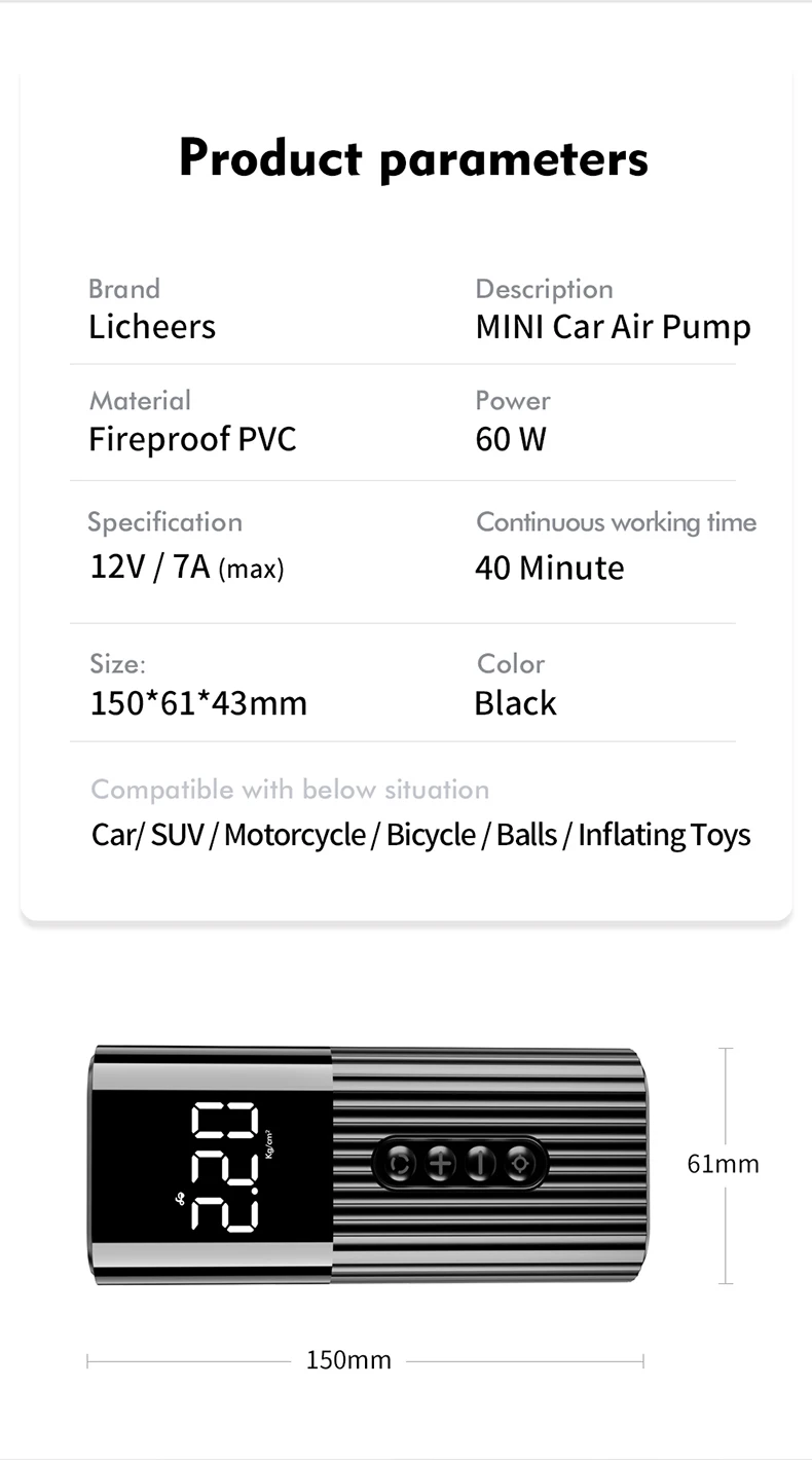 ① [Проводная портативная конструкция] Проводная конструкция и компактный миниатюрный размер этого шинного надувателя позволяют легко носить с собой и легко работать одной рукой. Вам нужно всего 4 шага, чтобы начать инфляцию. ЖК-экран показывает давление в реальном времени сбоку, так что вы можете контролировать давление, не сгибаясь, чтобы увидеть дно. ② [Быстрая автоматическая надувание] инфлятор шин имеет 4 переключаемых блока давления (PSI, BAR, KPA, KG/cm2), поэтому вы можете задать давление в шинах по мере необходимости. Когда установленное давление в шинах будет достигнуто, насос для шин автоматически отключится. Максимальное давление накачки составляет 150 фунтов на квадратный дюйм. ③ [Ночного использования] накачанном состоянии, один светодиодный светильник будет автоматически светильник или похода по магазинам. Есть светодиодный индикатор в нижней части и дисплей давления в реальном времени на ЖК-дисплее. Вы можете удобно использовать цифровой инфлятор в качестве манометра и накачки в темноте. ④ [Многофункциональный] насос для шин является портативным дизайном, который может покрывать все шины велосипедов, мотоциклов, автомобилей (включая внедорожник). Также оснащен 3 адаптерами сопла для матрасов/летательных аппаратов/игрушек/спортивных мячей/надувных изделий.