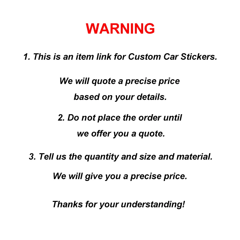 Это ссылка на товар для автомобильной наклейки на заказ. Мы указываем точную цену на основе ваших деталей. Не размещайте заказ, пока мы не предложим вам расценки. Сообщите нам количество, размер и материал. Мы предложим вам точную цену. Спасибо за понимание. (Не размещайте заказ на 1,3 долларов США, цена не составляет 1,3 долларов США за лист, мы не разрешаем делать заказ без каких-либо предложений для вас. Спасибо!)