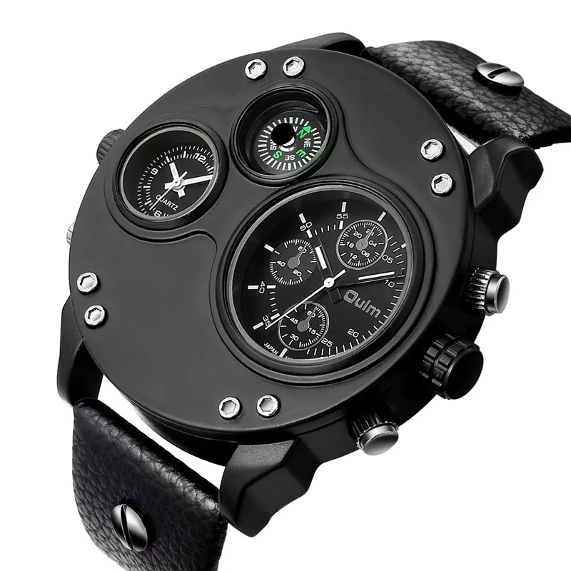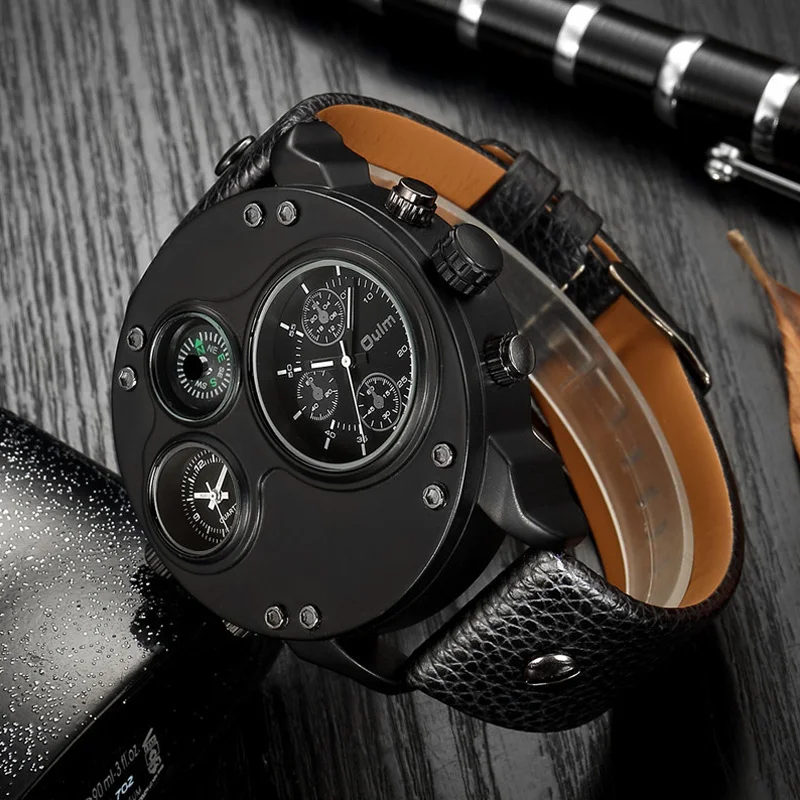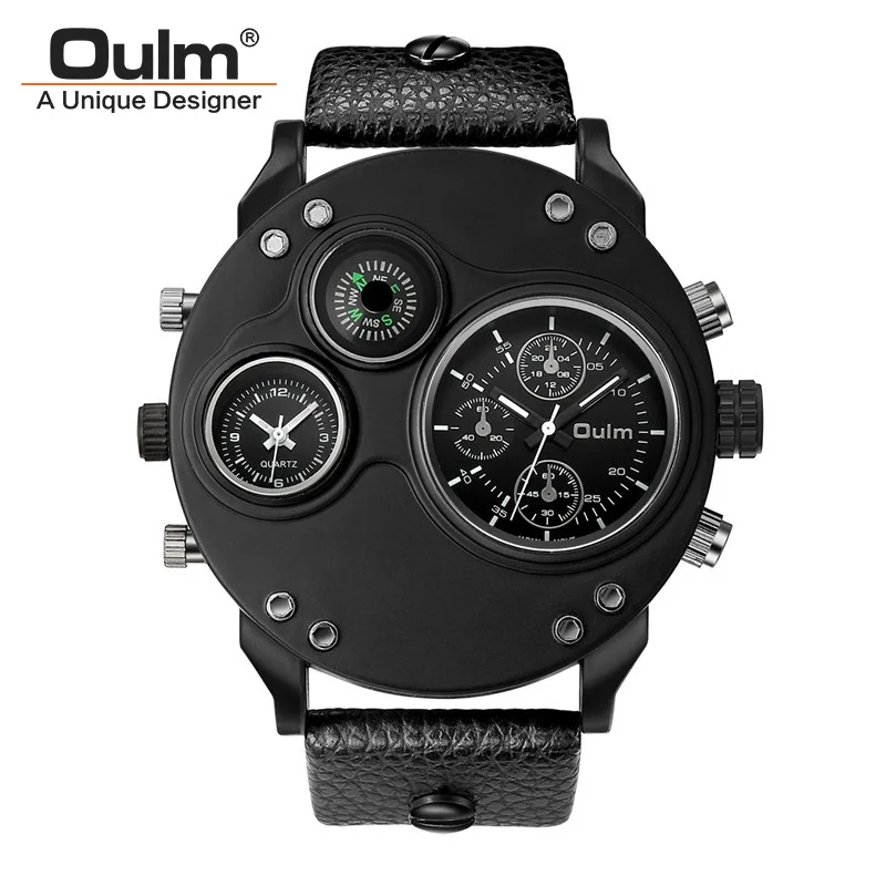 Часы наручные Oulm Мужские кварцевые, спортивные с несколькими часовыми поясами, с компасом, модные с кожаным ремешком, Прямая поставка