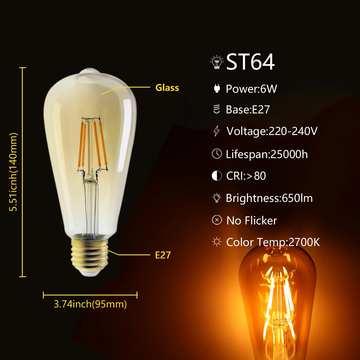 6 шт.лот St64 лампа накаливания 8 Вт E27 ретро Эдисон 220-240 В вин...