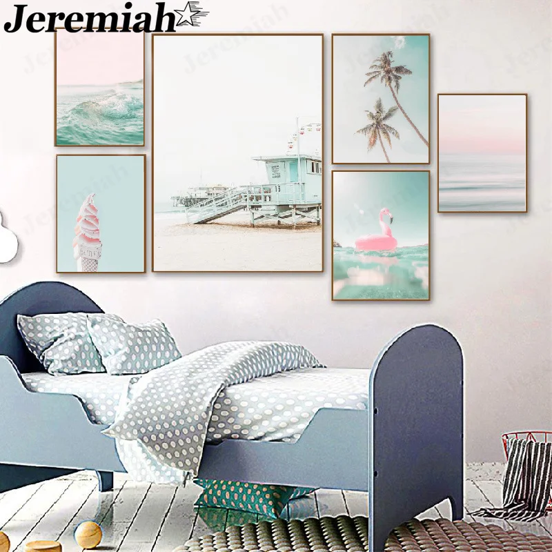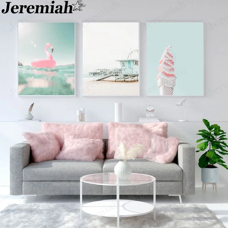 Плакат в скандинавском стиле с изображением летнего пляжа, розового, мятного, синего мороженого, плавательного кольца, настенное искусство, Современное украшение для дома и комнаты
