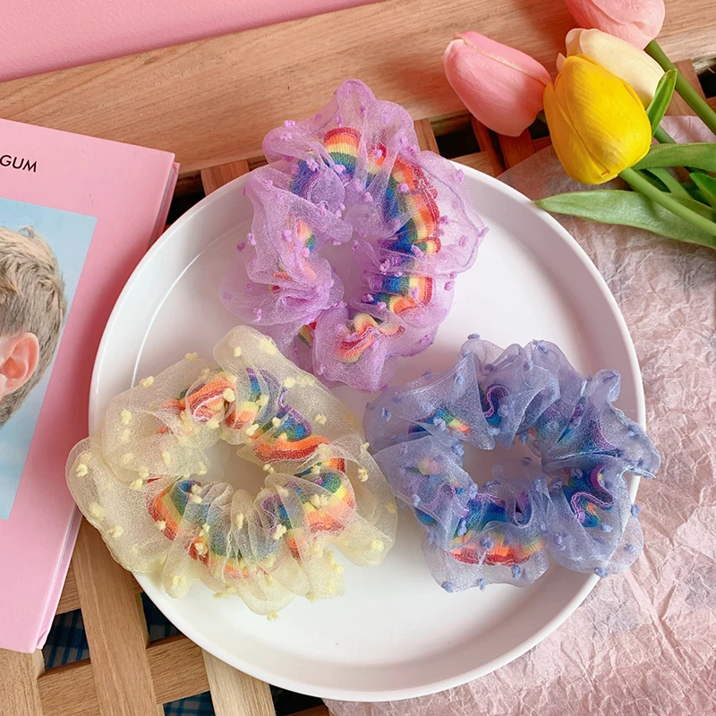 Резинка для волос в горошек с радужными звездами, эластичная сетчатая заколка для хвоста, милое кружевное кольцо для волос, аксессуары для волос из органзы, лето