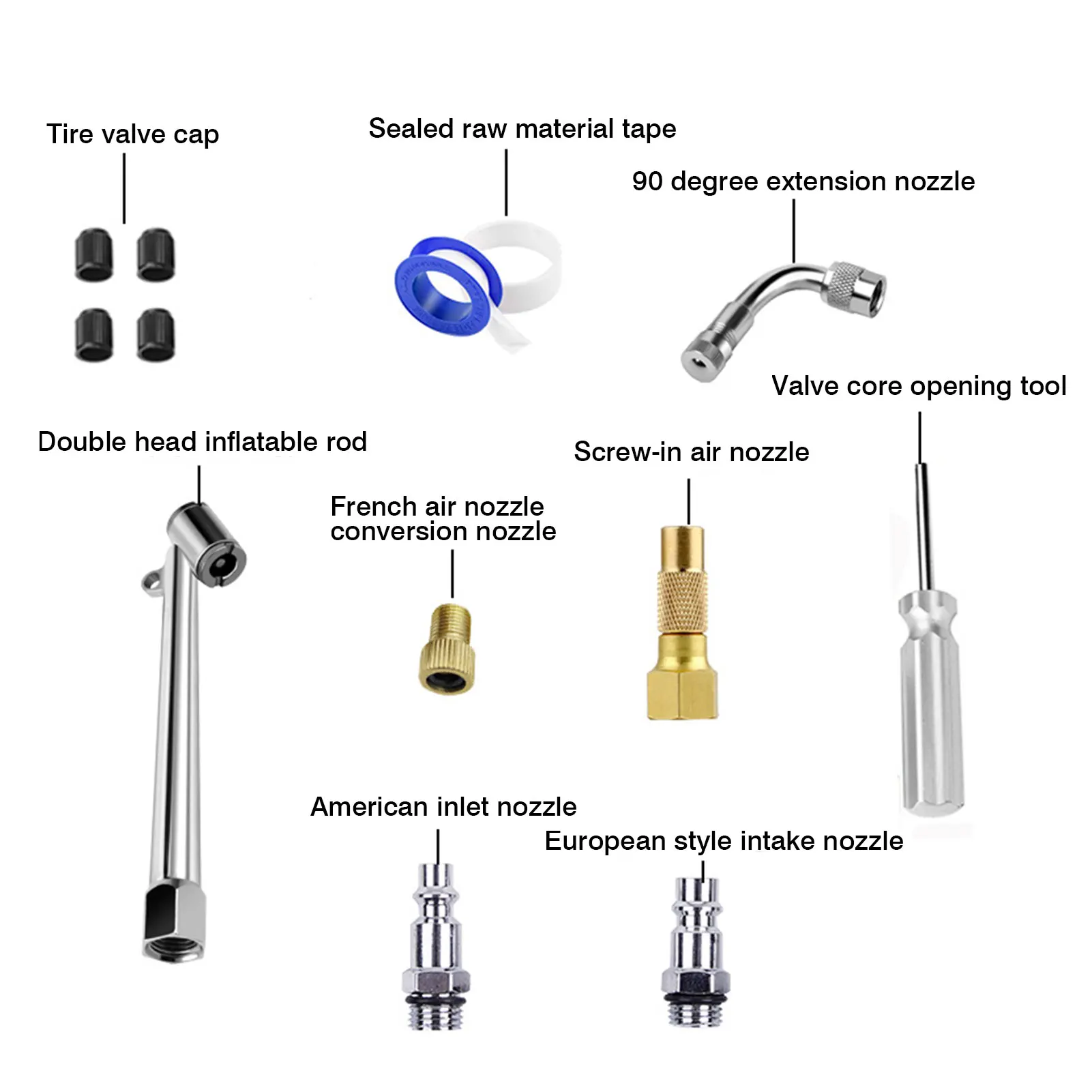 Упаковочный лист:Газовый счетчик с цифровым дисплеем (с улучшенным быстрым зажимом) * 1 (с задним светодиодным фонариком)Удлиненная надувная насадка на 90 ° * 1Надувное сопло с резьбовым винтом * 1Европейское впускное сопло * 1Насадка для французского велосипеда * 1Крышка клапана шины * 4Инструмент для открытия сердечника клапана * 1Уплотнительная лента * 1Надувной стержень с двойной головкой * 1Запасное уплотнительное резиновое кольцо патрона * 2Нейтральное руководство на английском языке * 1Упаковочная коробка * 1