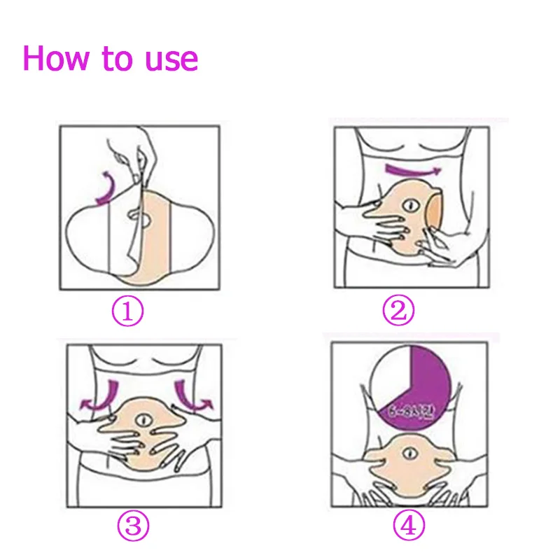 Патч непосредственно прикреплен к коже живота. 3-8 часов в день. Если вы чувствуете тепло, это нормальное сжигание жира. 4 недели в течение курса лечения.