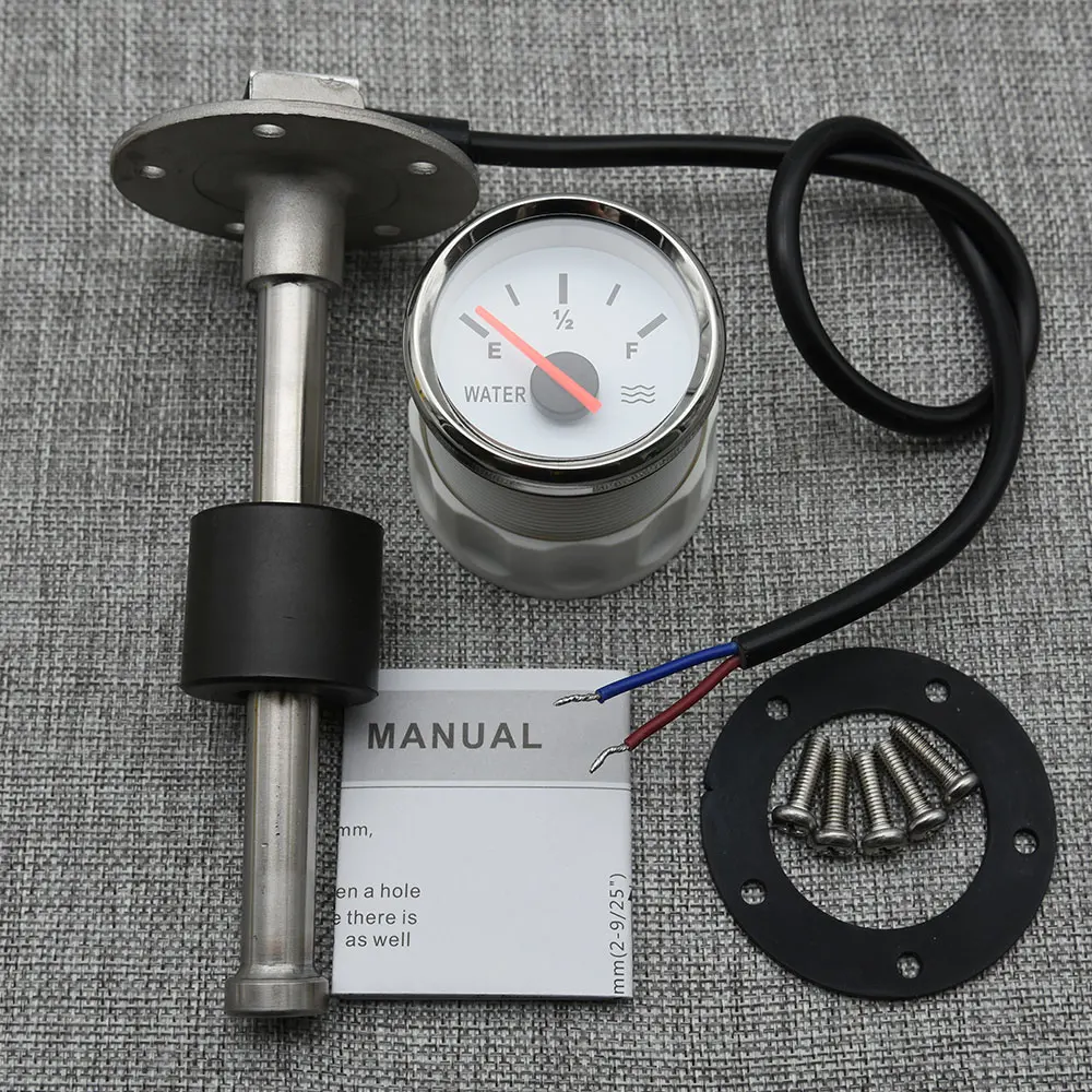 -Диапазон индикации: пустой до полного-Название: Датчик уровня воды-Размер крепления: 52 мм или 2-1/16"-Рабочее напряжение: 9-32 В/подходит для 12-24 В-Материалы: нержавеющая сталь + никелированный пластик-Входной сигнал: 240-33 Ом