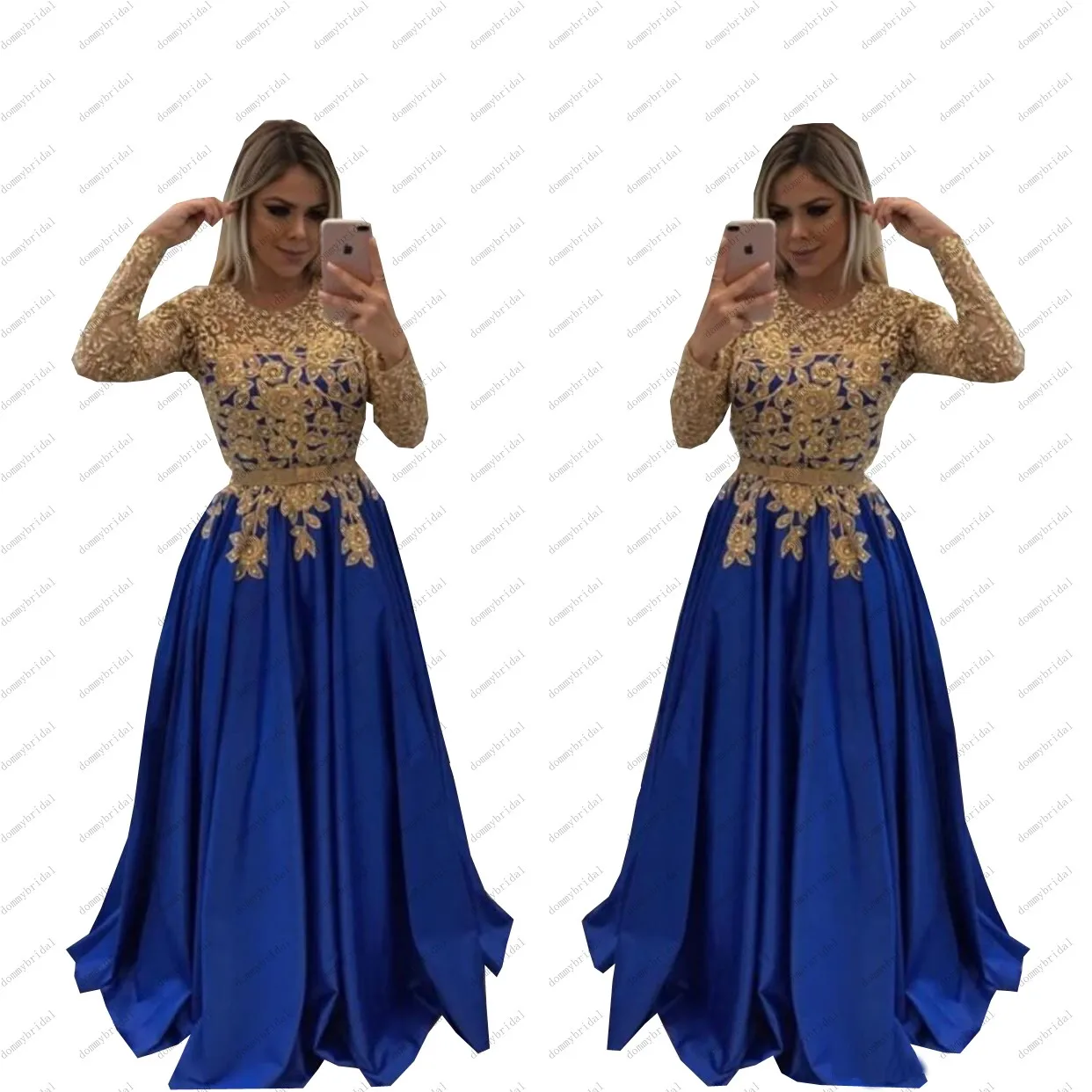 100% новинка, круглый вырез, иллюзия, длинные рукава, Золотая Кружевная аппликация, трапециевидный стиль, атлас, жемчуг и бисероплетение, длина до пола, африканские вечерние платья для выпускного вечера размера плюс Petite для женщин и девушек, Длинные