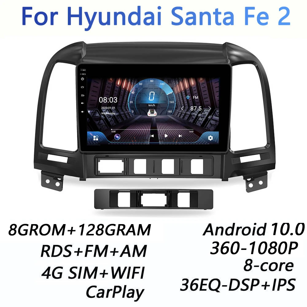 Автомагнитола 8G + 128GROM DSP 2 din Android 8. 0 4G NET, мультимедийный видеоплеер для Hyundai Santa Fe 2 10,0-2006 BT WIFI carplay