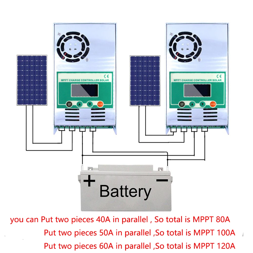 Это 100% MPPT контроллер солнечного зарядного устройства, 12V 24V 36V 48V автоматическая работа, он используется для свинцово-кислотных, гелевых, литиевых батарей. У нас есть 60A,Вы можете поставить две части 40A солнечных контроллеров параллельно, так что всего MPPT 80AВы можете поставить два pices 60A солнечные контроллеры параллельно, таким образом, всего MPPT 120A