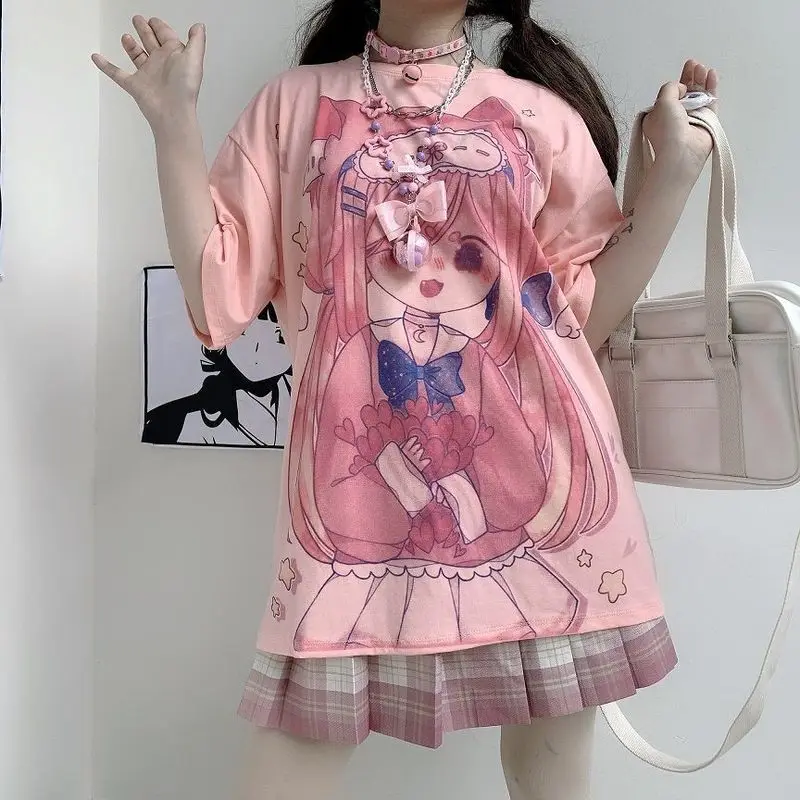 Летняя мягкая свободная футболка для девочек с коротким рукавом и принтом из японского аниме, модная Милая одежда с графическим рисунком, 2022