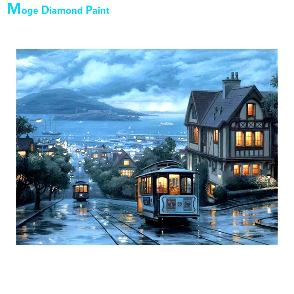 Ночной вид на город Харбор, трамвай, алмазная картина, круглая, полная дрель, Nouveaute, сделай сам, мозаика, вышивка 5D, вышивка крестиком, сценический узор