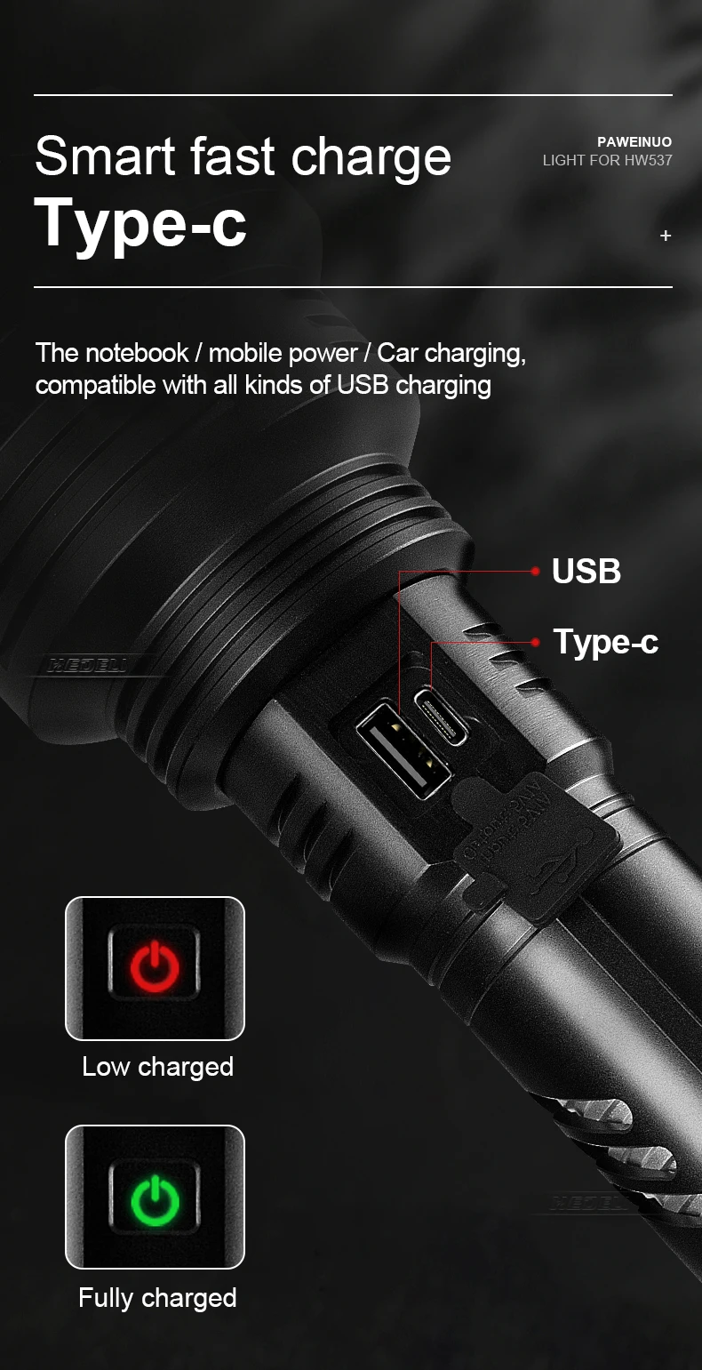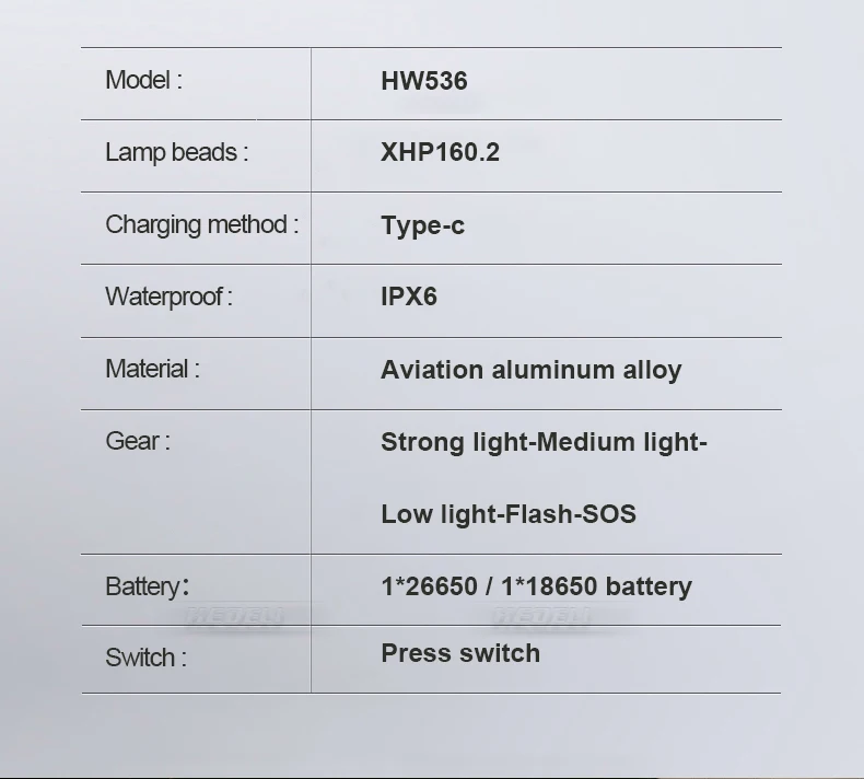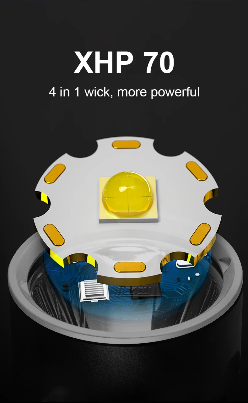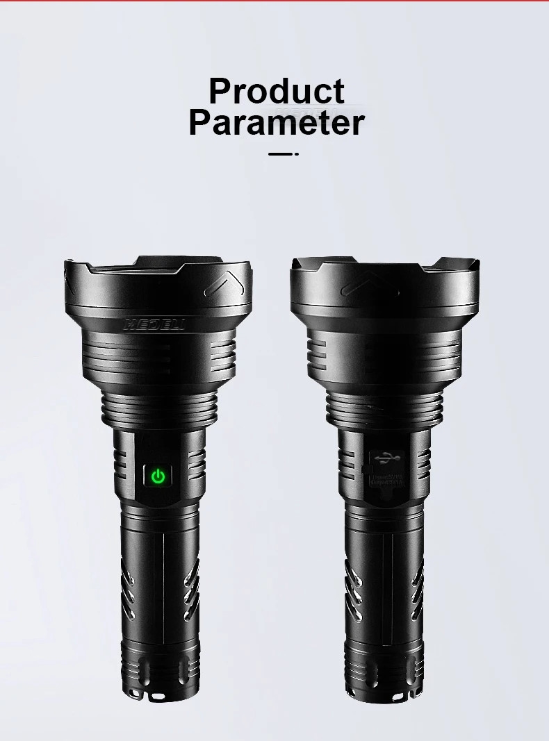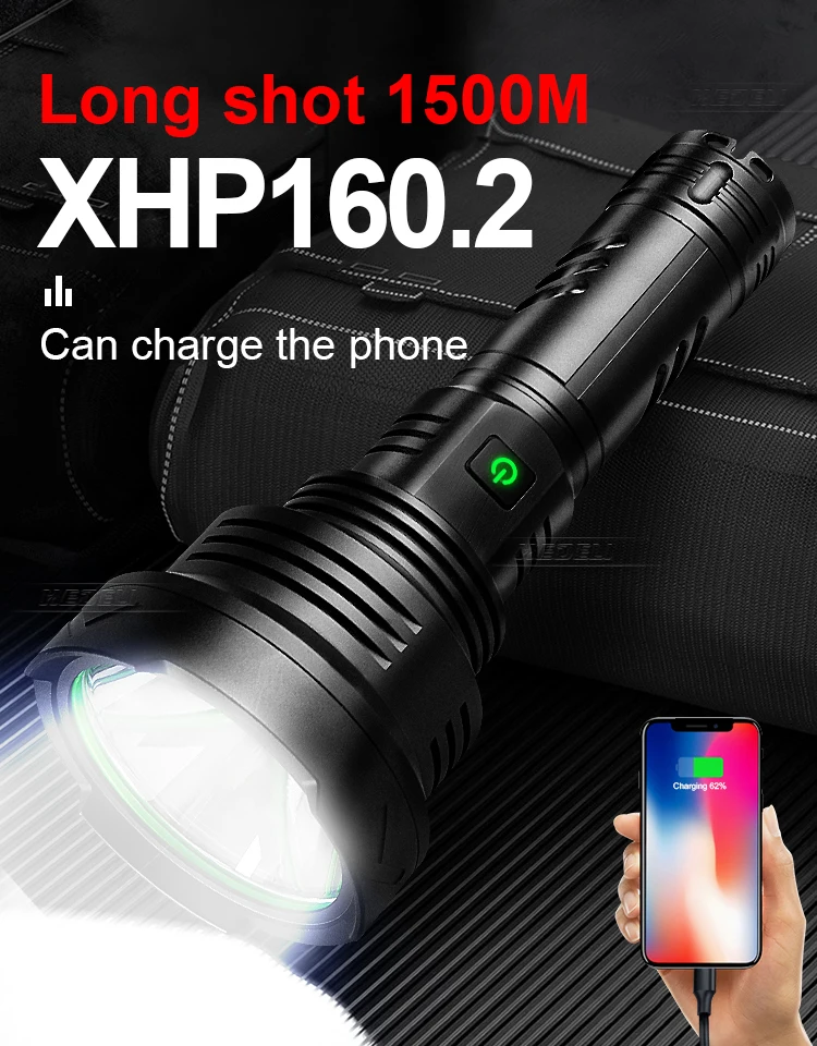Используя новейший XHP160.2LED, максимальная мощность достигает 800000 люменИзготовлен из авиационного алюминиевого сплава, прочный военный анодированный класса HAIIIСтепень водонепроницаемости достигает IPX-6, что обеспечивает водонепроницаемость, но не может использоваться в водеВо внутренней проводке используется Высокоэффективная схема наддува для максимального использования батареиВход Micro USB, подходит для компьютеров USB, автомобильных USB, других USB вилки для зарядкиВыход USB (5 В 2 а) позволяет быстро заряжать мобильные телефоны или другие электронные товары 5 ВПортативный дизайн, 5-режимный переключатель, прямое зарядное устройство, поддержка входа и выходаИспользуйте 1*18650 или 1*26650(Используйте батарею лучшего качества HEDELI для обеспечения времени использования продукта)Ударопрочная конструкция предотвращает случайное повреждение внутренней электронной техники.