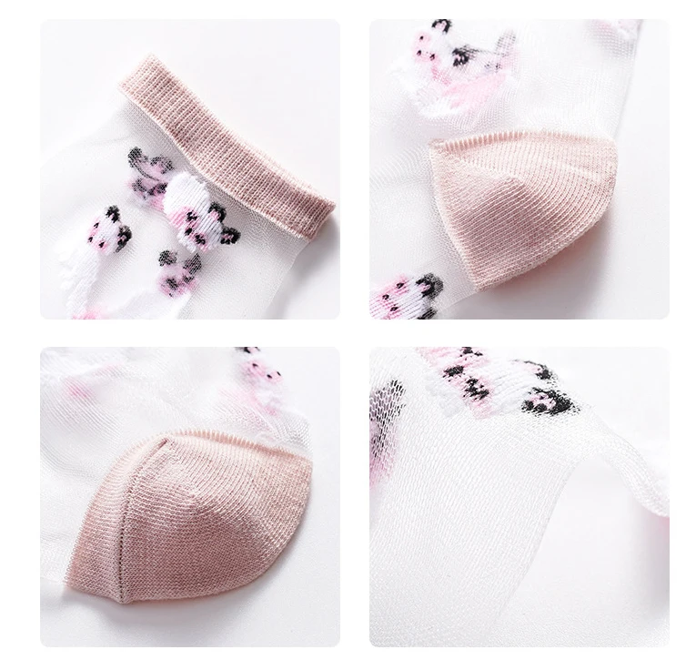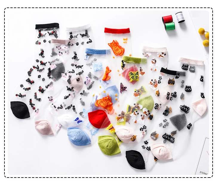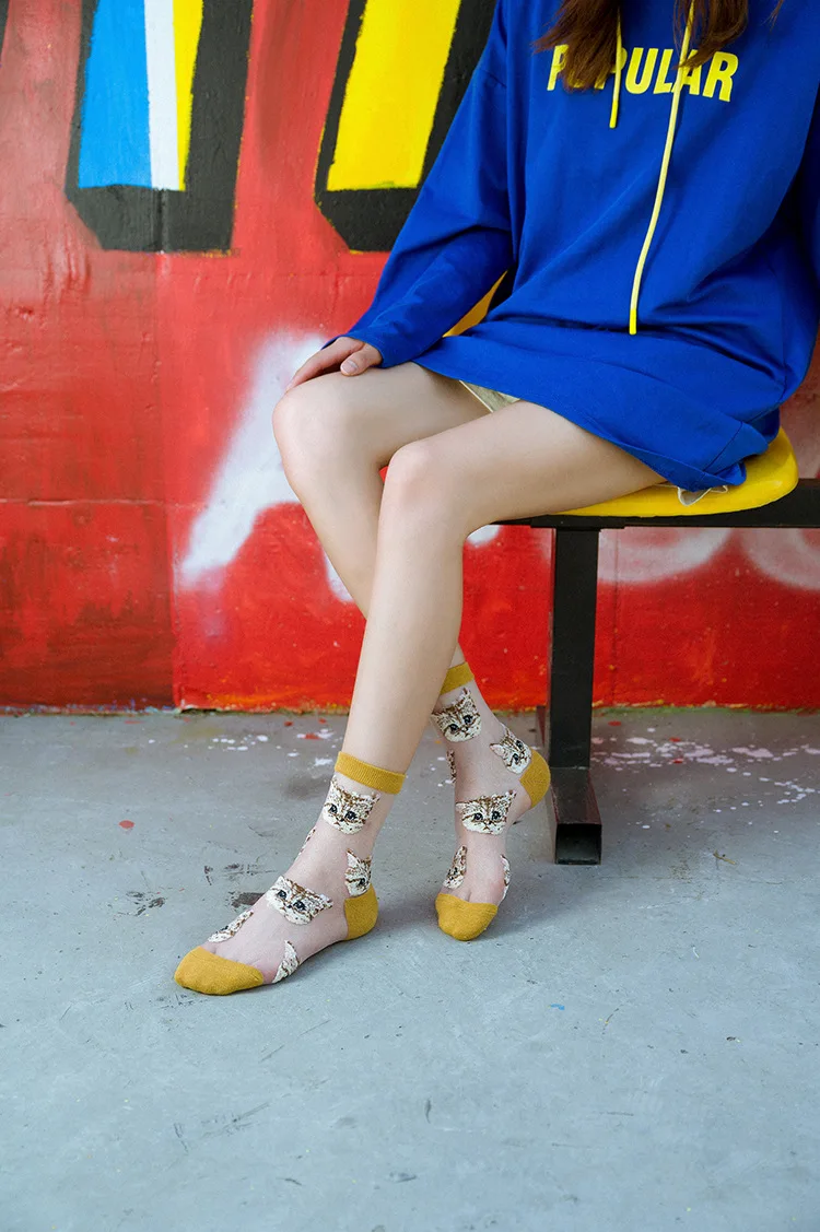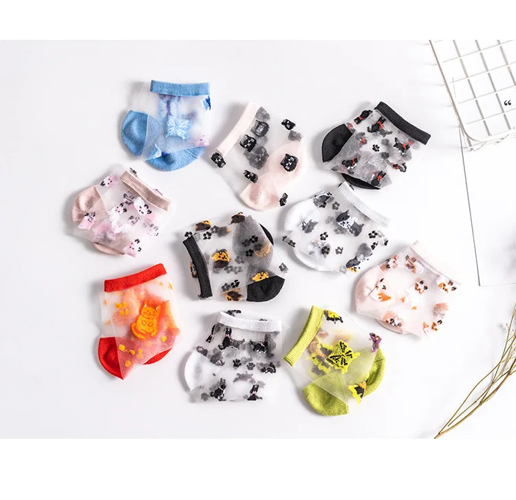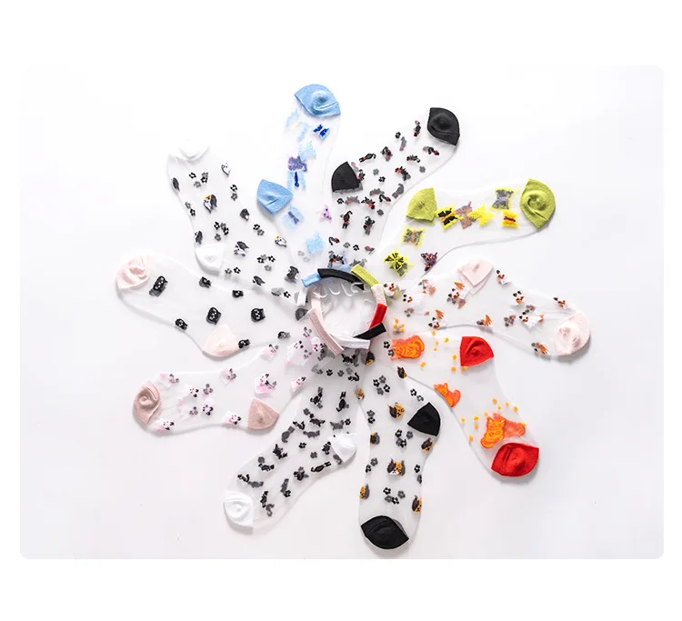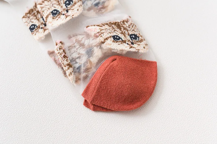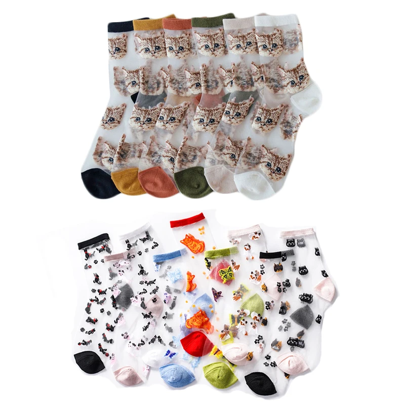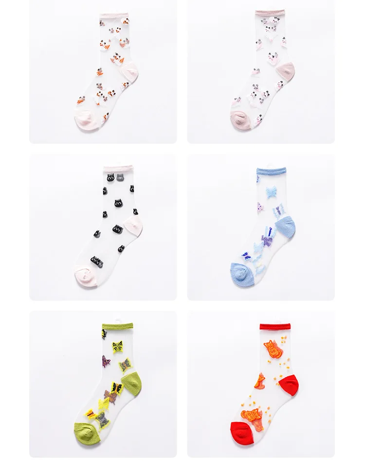 Кружевные женские носки, Мультяшные мягкие Смешные кавайные прозрачные носки в стиле Харадзюку из шелка, лисы, кошки, бабочки, удобные прозрачные весенне-летние носки