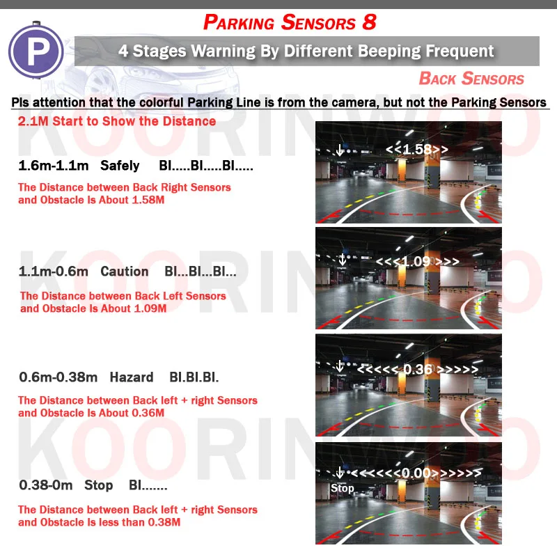 8 датчиков, двухъядерный, Автомобильная камера заднего вида, Система помощи при парковке, звуковая сигнализация. Изображение заднего хода автомобиля и расстояние фронтальной камеры могут отображаться на мониторе автомобиля.