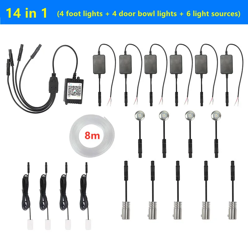 14-в-1: цветная (RGB) окружающей среды СВЕТОДИОДНЫЙ до 8 м интерьера автомобилей Оптическое волокно полосы светильник с помощью приложения Управление 12 В Декоративные Атмосфера лампы