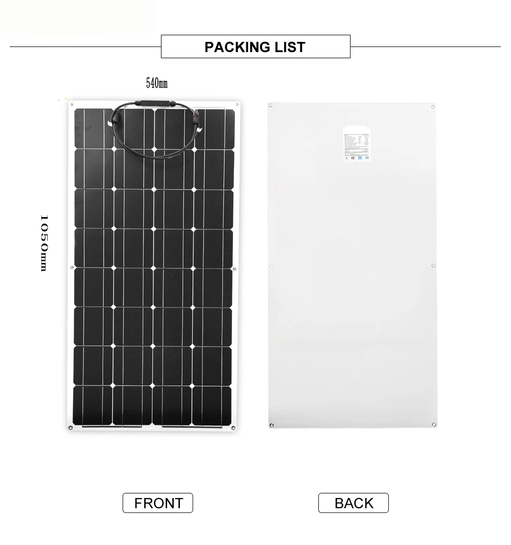 5: 100 Вт ПЭТ солнечная система1, гибкие солнечные панели 100 Вт 18В,2015 г. 1 предмет; Размер: 1050 мм * 540 мм * 2,5 мм. 2, 10A, 12V/24V режимы Auto, pwm контроллер солнечного заряда; 1 шт. 3, 3 м удлинитель солнечного кабеля; Красного и черного цветов; 1 комплект; 4, 3 м батарея соединительный кабель; 1 комплект