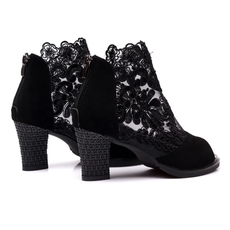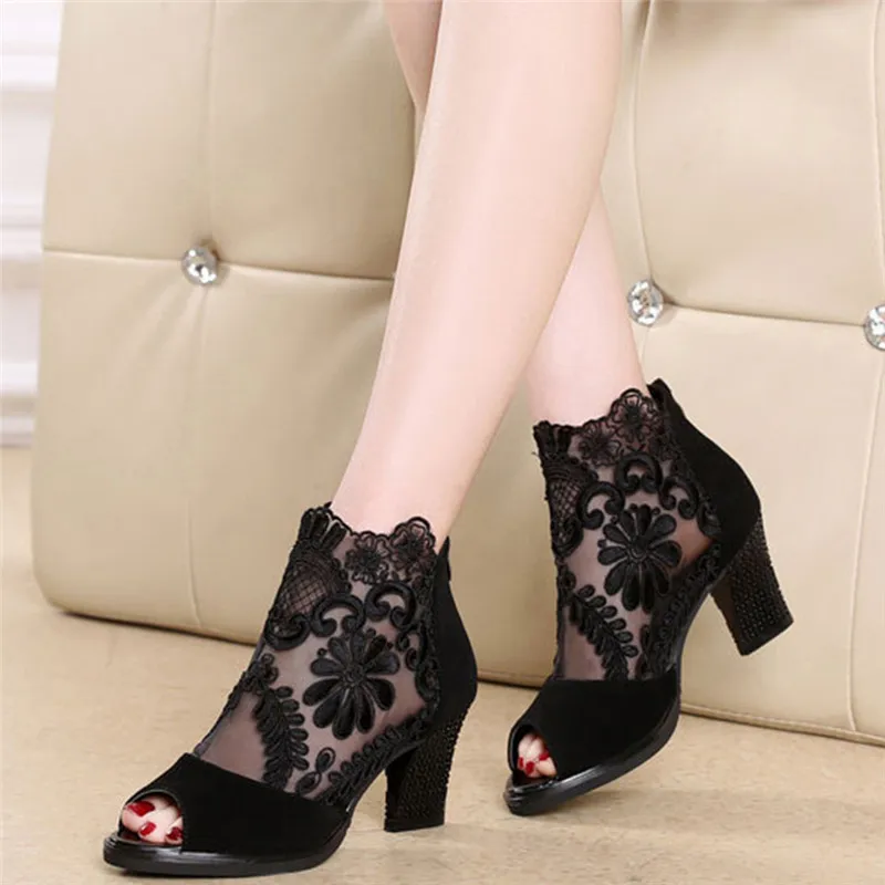 Женские ботильоны на высоком квадратном каблуке, ботинки с кружевом и открытым носком, туфли-лодочки с вышивкой, лето 2021