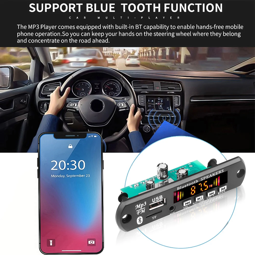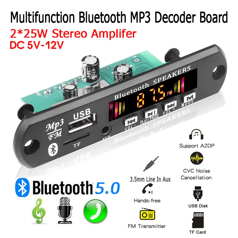 Радио FM частота: 87,5-107,5 МГцПоддержка функции: поддержка MP3 / USB / TF / LINE IN / FM / BLUETOOTH/дистанционное управление/DC 5 В или 12 В (опционально)О конструкции: Размер панели: 75*50 мм, панель окружена винтовыми отверстиями, глубина панели 18 мм2. Описание функции записи1. Нажмите кнопку MODE, чтобы начать запись, и нажмите кнопку MODE снова, чтобы отменить функцию записи;2. Нажмите кнопку MODE еще раз, чтобы воспроизвести файл записи;3. При записи необходимо подключить устройство хранения, например, u-диск или tf-карта;